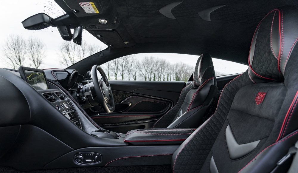 Inside, the DBS boasts pure black leather and alcantra seats with red stitching and bespoke TAG Heuer quilting, each displaying the TAG Heuer logo, and carbon fibre and dark chrome has been used throughout to accentuate the clean lines of the cockpit.