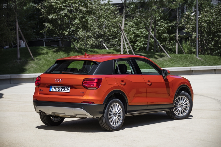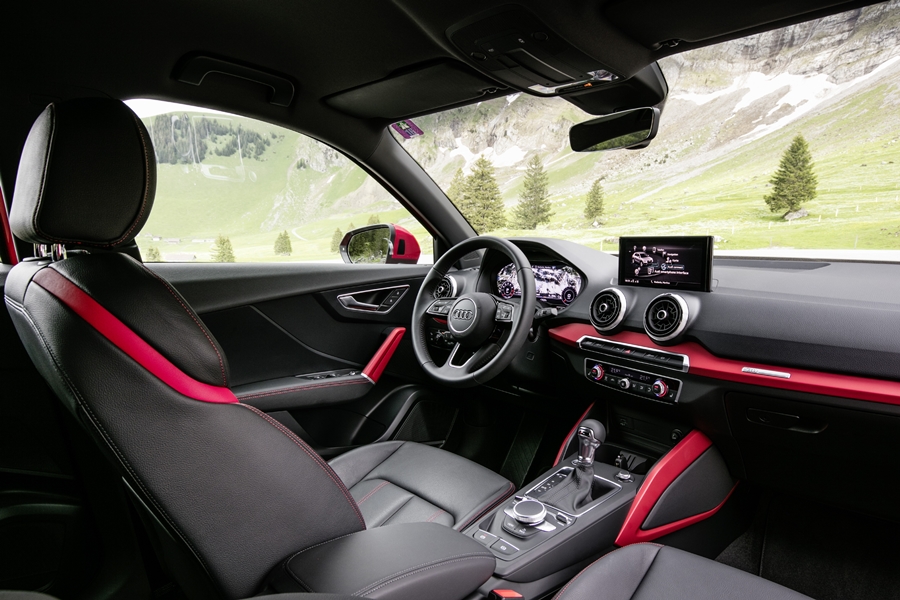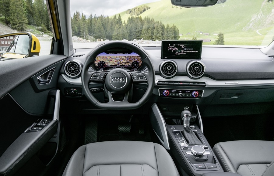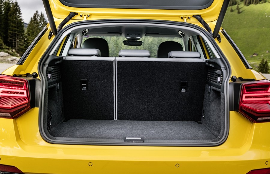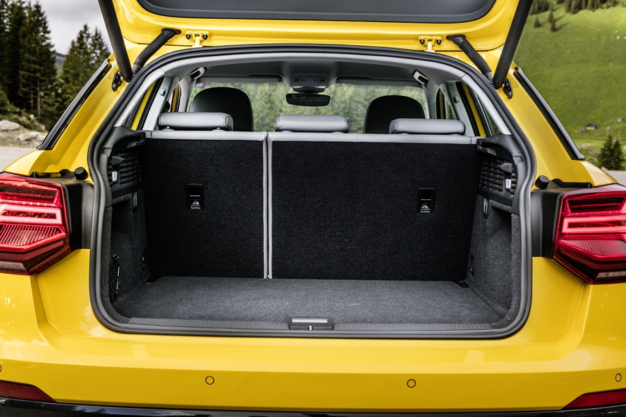 Las puertas de amplia apertura y un alto umbral típico de los SUV permiten acceder fácilmente al interior del Audi Q2, que ofrece espacio para cinco pasajeros y mantiene el lenguaje de diseño tenso y anguloso de la carrocería. El conductor se siente en un deportivo por la posición de conducción, pero disfruta de una buena visibilidad. El maletero tiene una capacidad de 405 litros y puede aumentar hasta los 1.050 litros cuando se abate el respaldo de los asientos traseros. Las opciones incluyen portón de accionamiento eléctrico y respaldos de los asientos traseros divididos en tres secciones; la sección central sirve como un gran paso directo de carga, práctico para el transporte de objetos largos como por ejemplo unos esquís o una estantería.