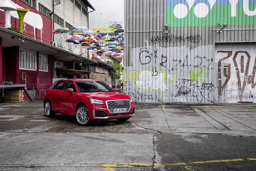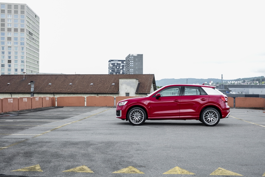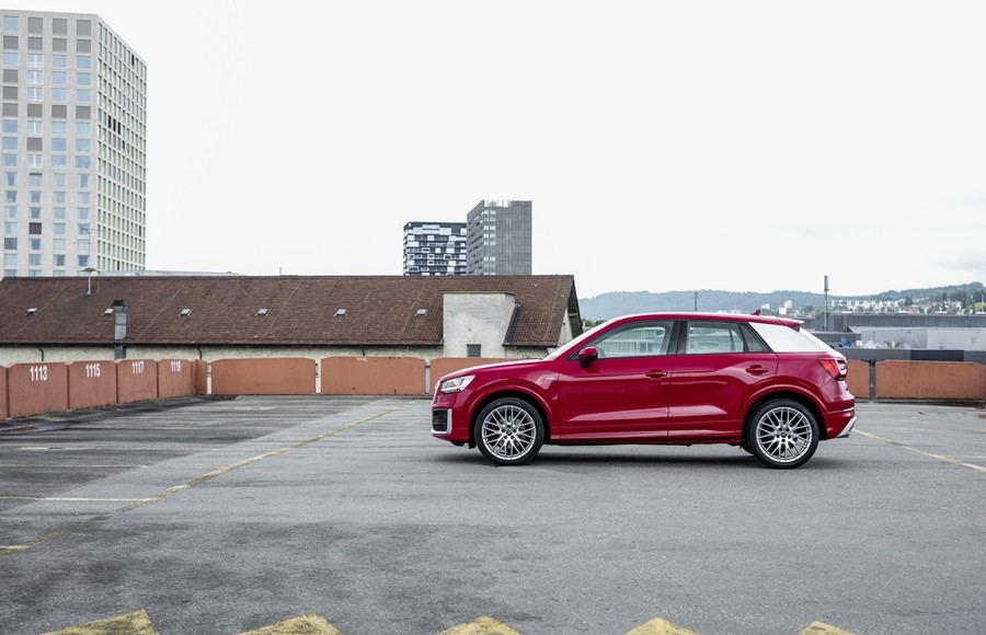 El resultado: un SUV poderoso y enérgico. En la parte delantera la parrilla Singleframe de diseño octogonal en una posición elevada, así como las amplias entradas de aire otorgan al frontal una fuerte imagen. Especialmente llamativa resulta la baja línea del techo, que desciende hasta integrarse en los pilares C por medio de los blade de color personalizable. Este contraste acentúa la deportividad del Audi Q2. En la parte trasera, un spoiler largo y el difusor en la parte inferior junto a la protección para los bajos ofrecen una apariencia dinámica. Desde su vista lateral, la alta línea de cintura resulta especialmente llamativa, al igual que los flancos con un diseño que se mueve hacia el interior de la zona de las puertas, enfatizando los pasos de rueda y con ello el carácter quattro del SUV compacto. El coche mide 1,51 metros de alto y 1,79 metros de ancho. Los voladizos son cortos, con una longitud total que alcanza los 4,19 metros y una distancia entre ejes de 2,60 metros, lo cual quiere decir que el Audi Q2 encajará en cualquier plaza de aparcamiento.