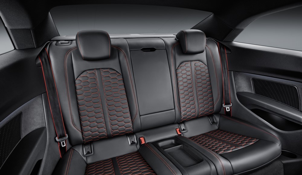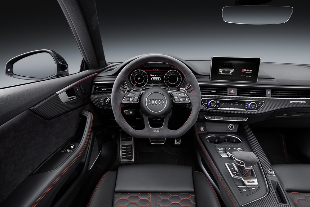 Teñido de color negro, el interior del nuevo RS 5 Coupé resulta extremadamente exclusivo y deportivo. Detalles como los asientos RS tapizados en cuero Fine Nappa con costuras de trama de diamante y el volante multifunción RS con la parte inferior achatada, ponen de relieve el carácter del coupé de altas prestaciones también en su interior. Los logos RS aparecen, además de en los asientos y el volante, en los umbrales de las puertas y en el selector del cambio. Una función especifica en el tablero digital Audi virtual cockpit proporciona información sobre la presión de los neumáticos, el par motor y las fuerzas G. Una luz de cambio le indica al conductor que cambie de marcha al alcanzar el límite de revoluciones. El paquete de diseño RS utiliza el rojo como tonalidad de contraste. Los elementos más destacados que incorpora son el volante, la palanca selectora, la zona destinada a las rodillas, los cinturones de seguridad y las alfombrillas, todos ellos con un toque en ese color. Audi Sport ofrece el verde Sonoma metalizado de manera exclusiva en el RS 5 Coupé.