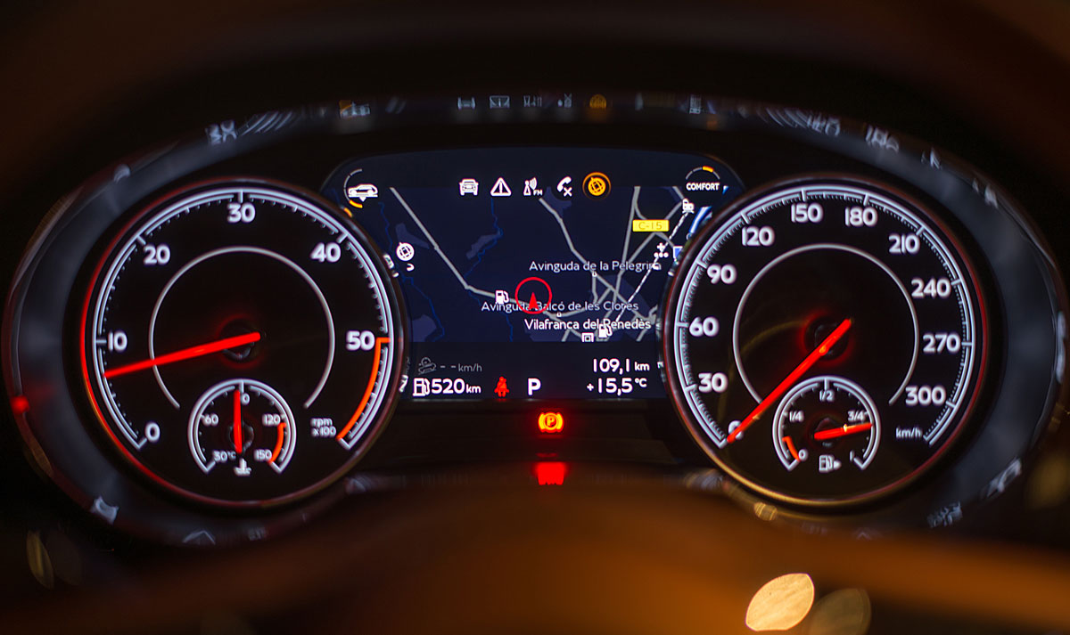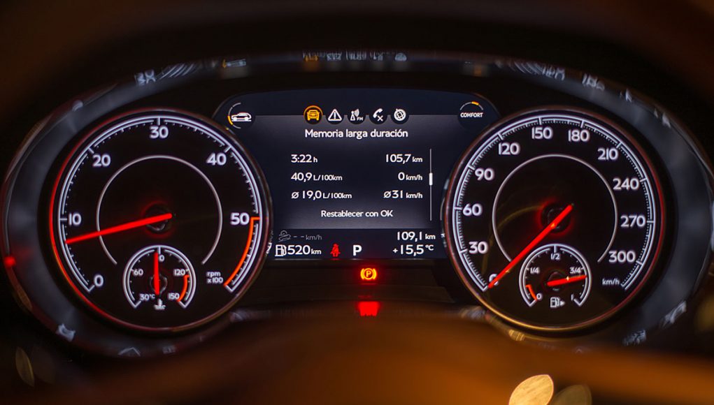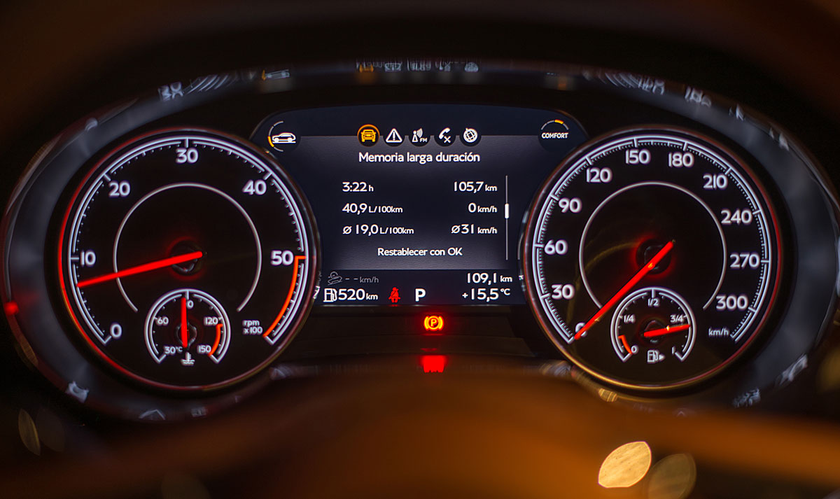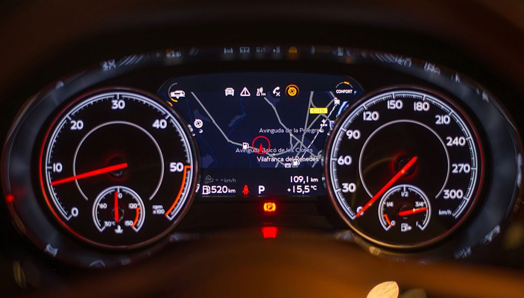 Tras el volante, multifunción que incorpora las levas para accionar el cambio de forma secuencial, encontramos un cuadro de mandos de nueva concepción, donde dos esferas separadas por un display tft, ofrecen información sobre los modos de conducción la navegación, el sistema de audio o el ordenador de a bordo. Bajo las salidas de aire del centro de la consola y sus originales tiradores que permiten su apertura, encontramos una pantalla táctil de 8”, desde la que se maneja todo el sistema de info entretenimiento, así como la distribución del aire del climatizador, el equipo de sonido o diversos parámetros de configuración del coche.