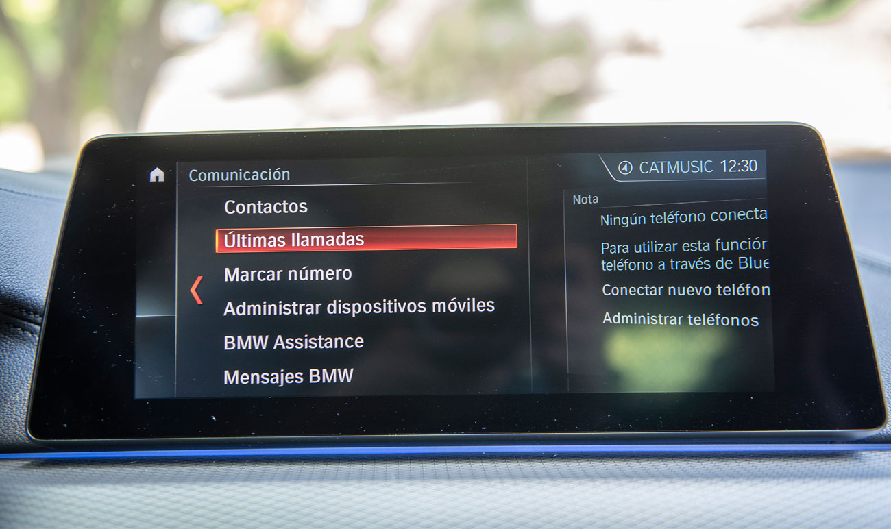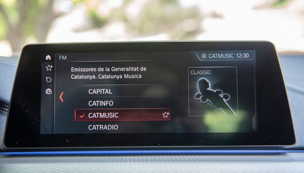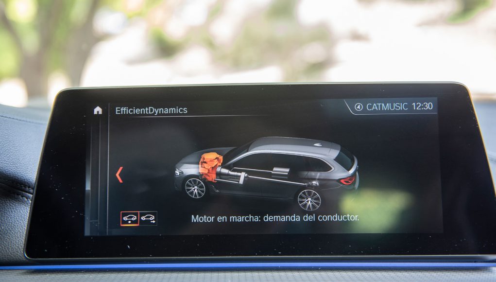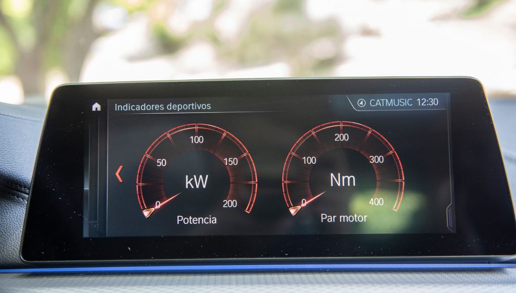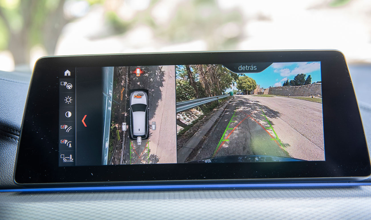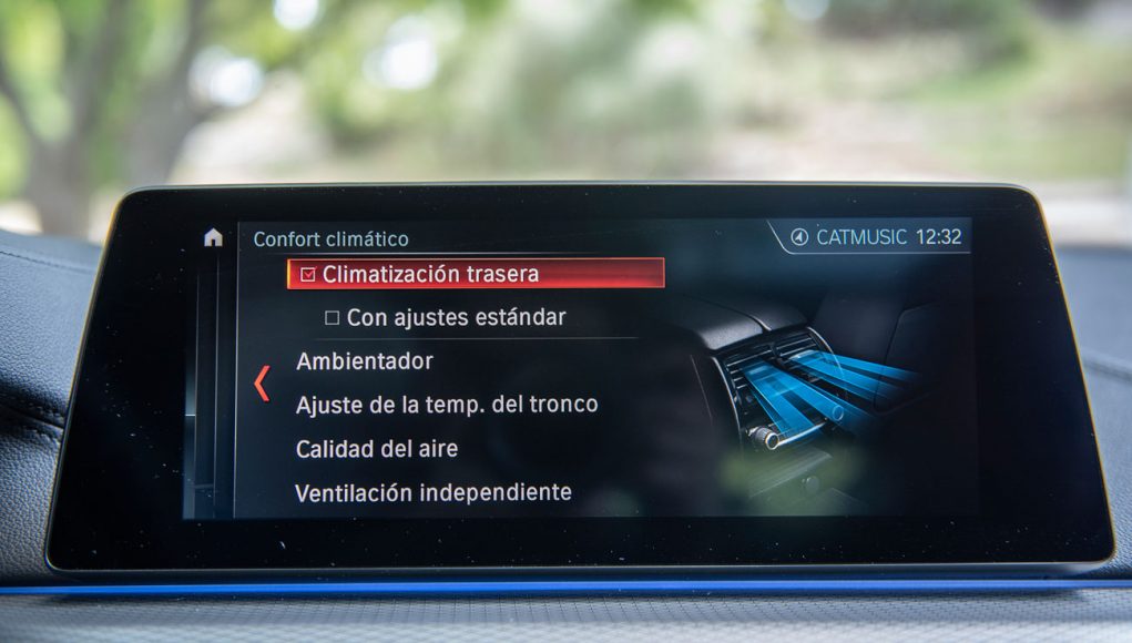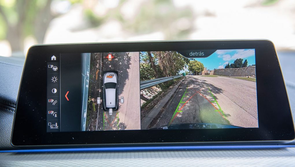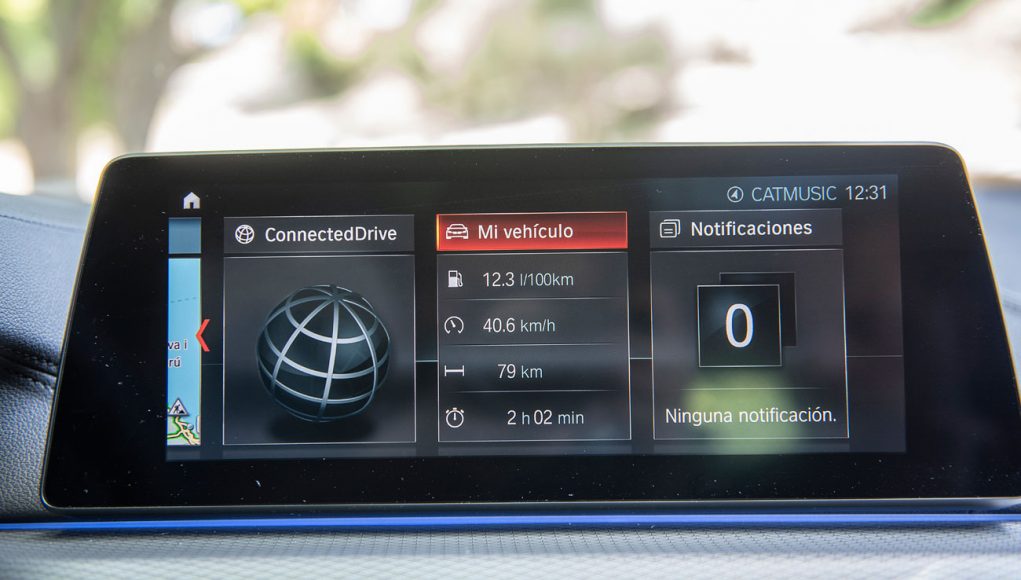 El cuadro de mandos digital dispone de tres vistas diferentes en función del modo de conducción escogido (Normal, ECO o Sport), ofreciendo unas grafías en diferentes tonalidades que junto al Head-up-Display y la pantalla de 10,25” forma parte del equipamiento opcional y del paquete Innovation. Esta pantalla es táctil, a la vez que se puede controlar mediante gestor o por el control por voz, y permite el manejo de todo el sistema de infoentretenimiento, a la vez que, para configurar diversos parámetros de conducción, como el selector de modos de conducción. Junto al selector del cambio, encontramos el mando iDrive, así como una pequeña guantera en la que de forma inalámbrica se puede cargar el móvil o la llave.