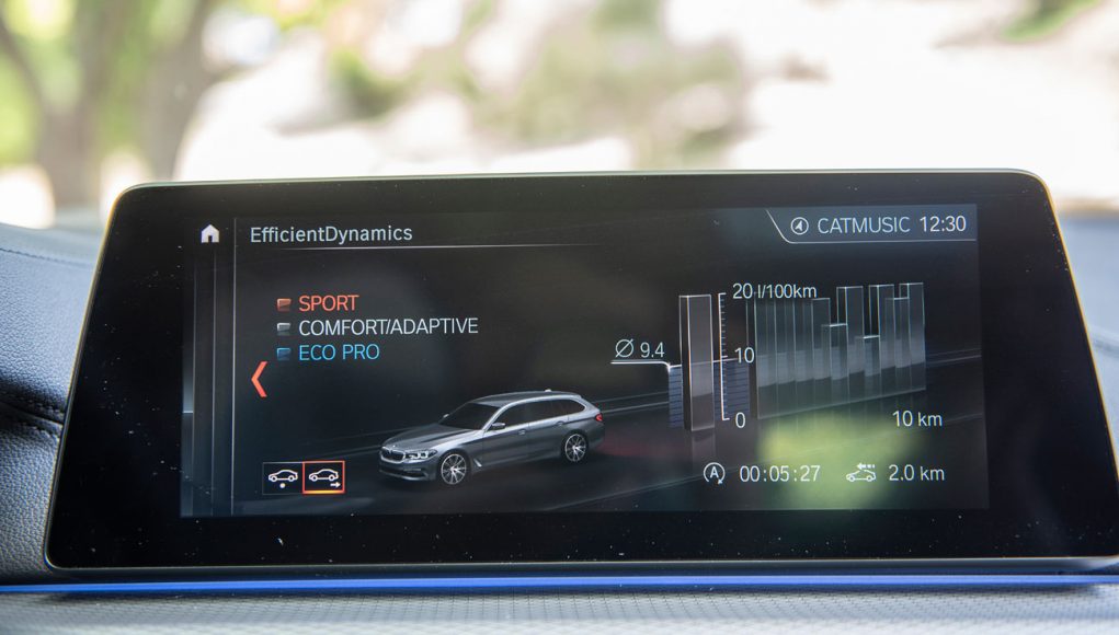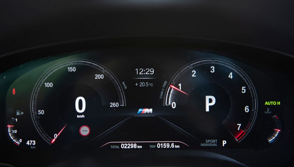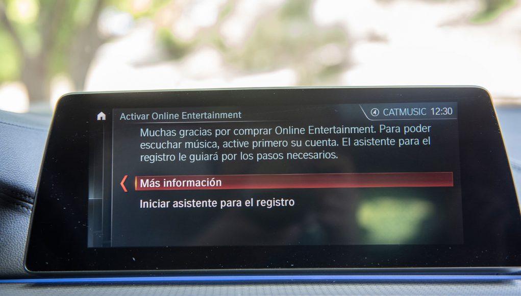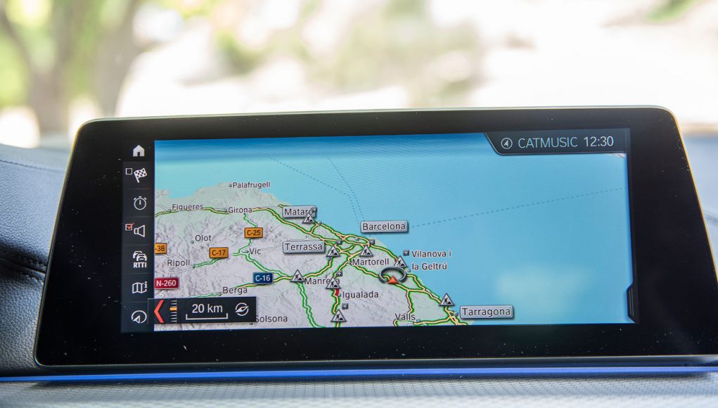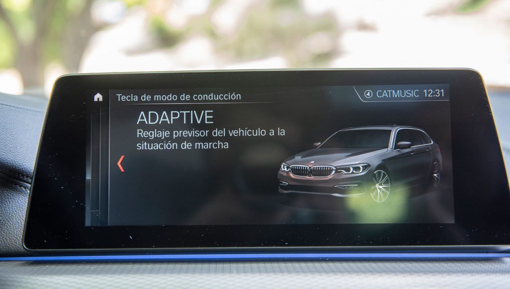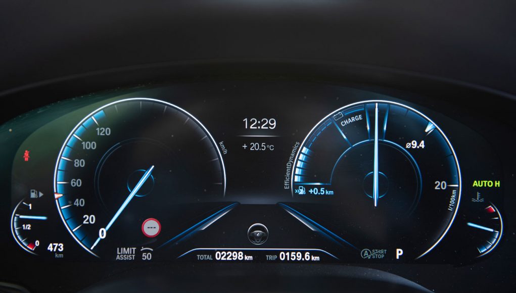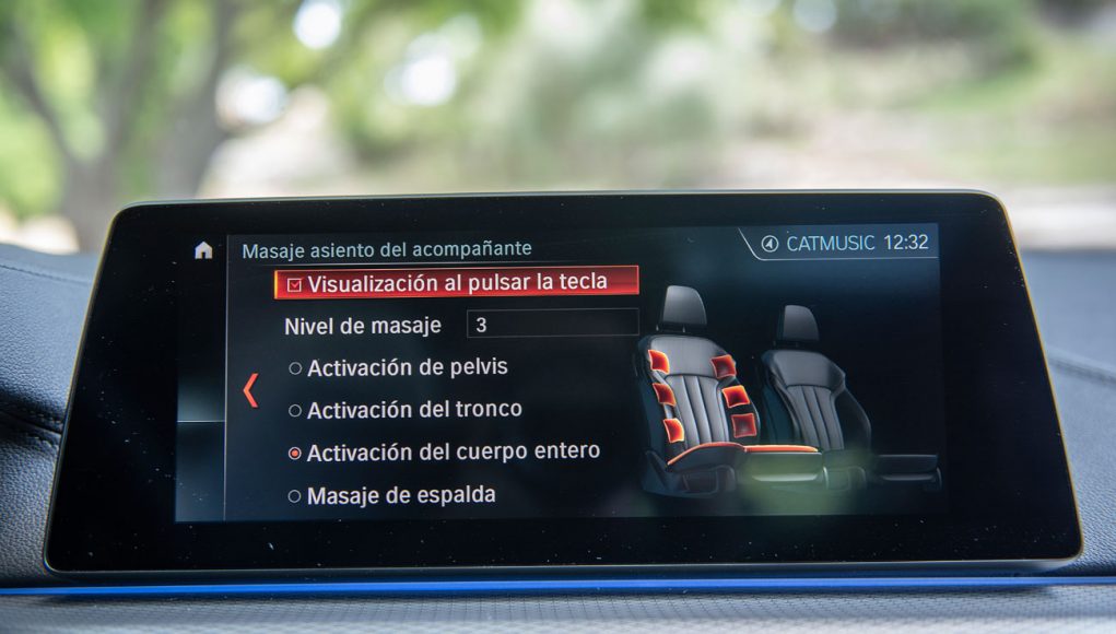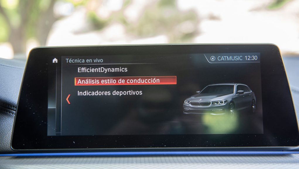El cuadro de mandos digital dispone de tres vistas diferentes en función del modo de conducción escogido (Normal, ECO o Sport), ofreciendo unas grafías en diferentes tonalidades que junto al Head-up-Display y la pantalla de 10,25” forma parte del equipamiento opcional y del paquete Innovation. Esta pantalla es táctil, a la vez que se puede controlar mediante gestor o por el control por voz, y permite el manejo de todo el sistema de infoentretenimiento, a la vez que, para configurar diversos parámetros de conducción, como el selector de modos de conducción. Junto al selector del cambio, encontramos el mando iDrive, así como una pequeña guantera en la que de forma inalámbrica se puede cargar el móvil o la llave.