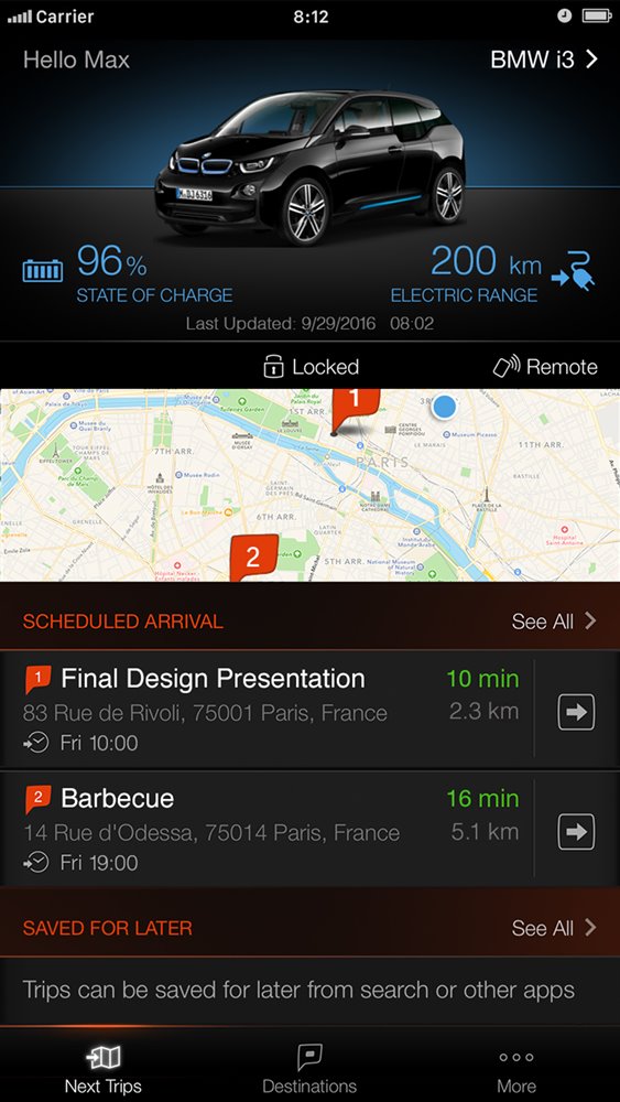 Asimismo, BMW Connected recoge sitios y ‘puntos de interés’ especiales de otras apps, con las que se puede establecer la hora de llegada deseada, almacenarlos y transmitidos de forma inalámbrica en unos sencillos pasos al sistema de navegación del vehículo. La función, «destinos personales aprendidos» reconoce continuamente los sitios a los que se ha viajado y los almacena automáticamente como destinos favoritos, que quedan accesibles en la pantalla principal de la aplicación. De forma complementaria, BMW Connected reconoce también los patrones de movilidad, como por ejemplo el viaje diario del trabajo a casa. En caso de que haya condiciones en el tráfico que retrasen el tiempo de llegada, BMW Connected informa de manera proactiva y propone una ruta alternativa con la hora de llegada más temprana. Con estas funciones, el usuario puede planificar cómodamente su día.