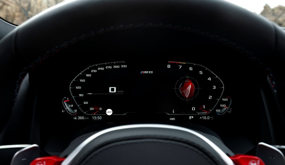 En el modo SPORT, la instrumentación y el Head-Up Display cambian a modo de visualización M. Solo muestra información relevante para una conducción deportiva, como los indicadores de velocidad específicos M, las indicaciones de cambio de marcha, un indicador digital de la velocidad y la marcha que está engranada. Informaciones como la temperatura del refrigerante, la presión de sobrealimentación, la condición de los neumáticos, la aceleración lateral y longitudinal se pueden ver a los lados de la instrumentación. El Head-Up Display se centra en el régimen del motor y las indicaciones de cambio de marcha, del navegador, los avisos de distancia, la marcha seleccionada y la velocidad del vehículo, además de los límites de velocidad, prohibición de adelantar y la información del sistema Speed Limit Info. Al pulsar de nuevo el botón del M Mode, el sistema vuelve al modo por defecto ROAD.