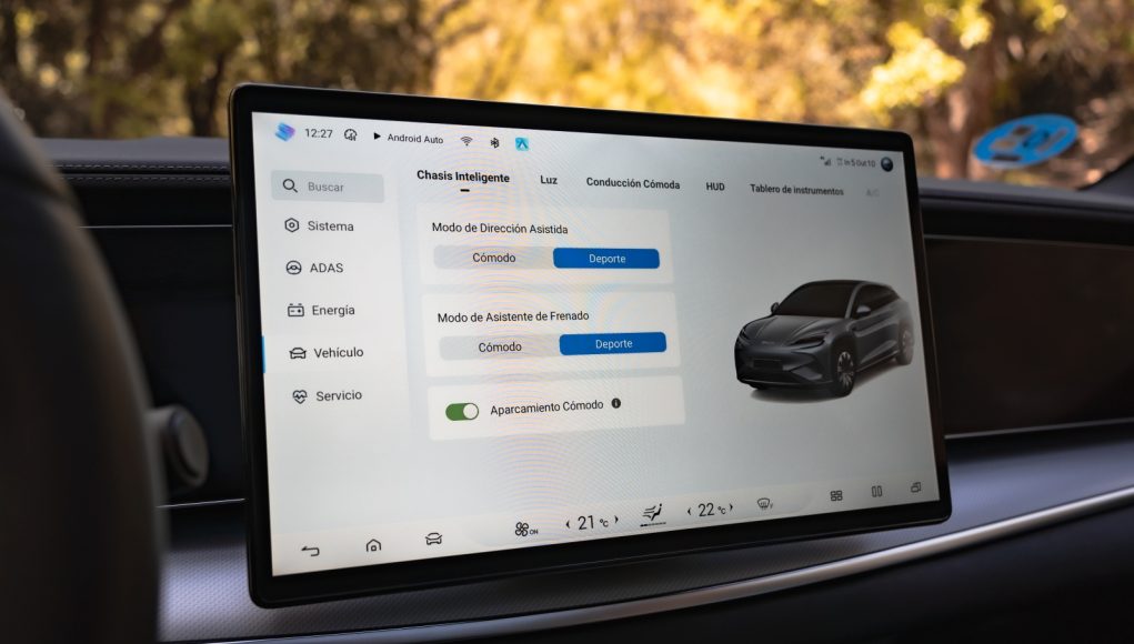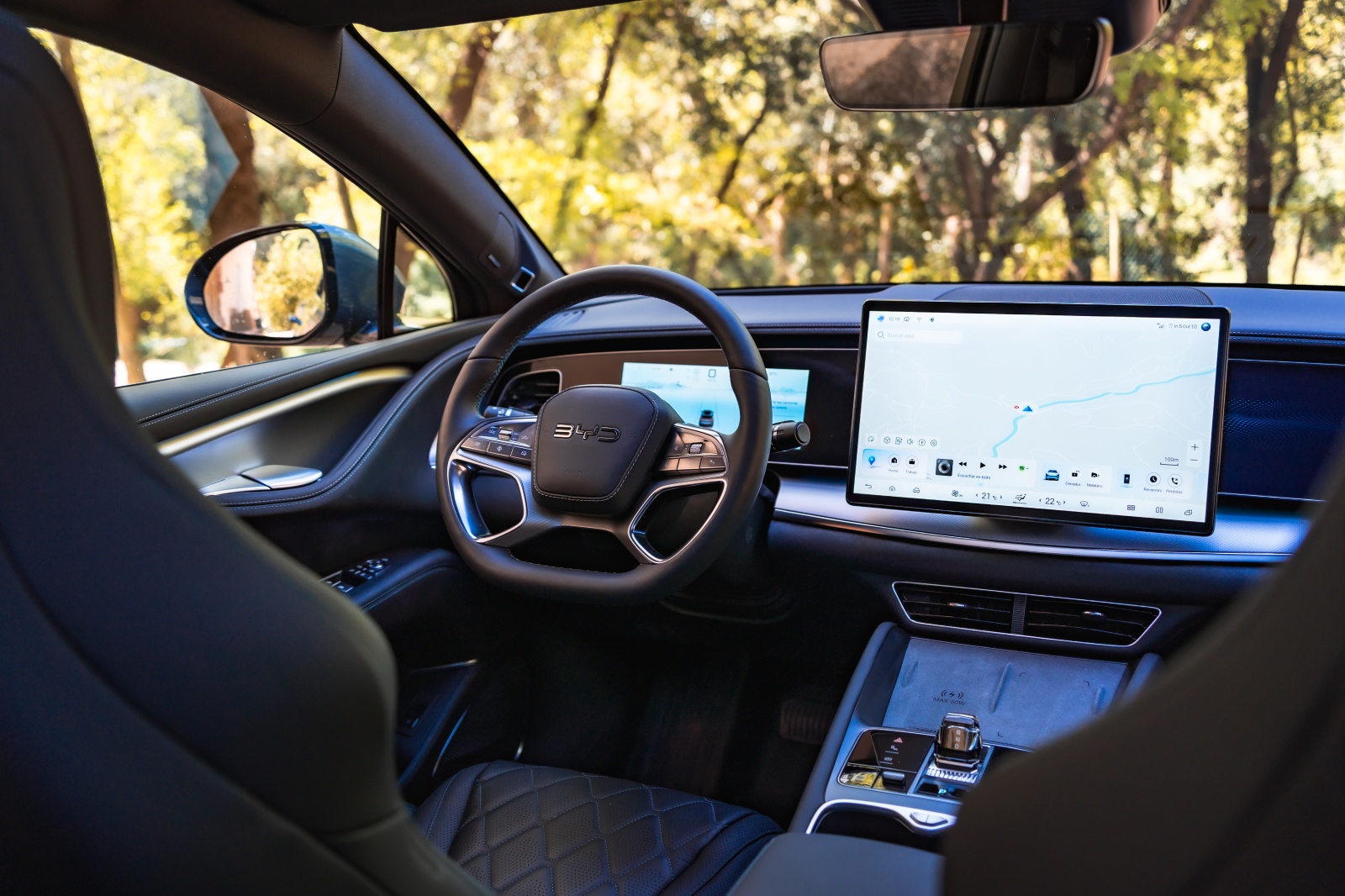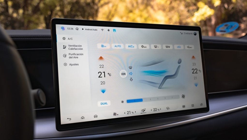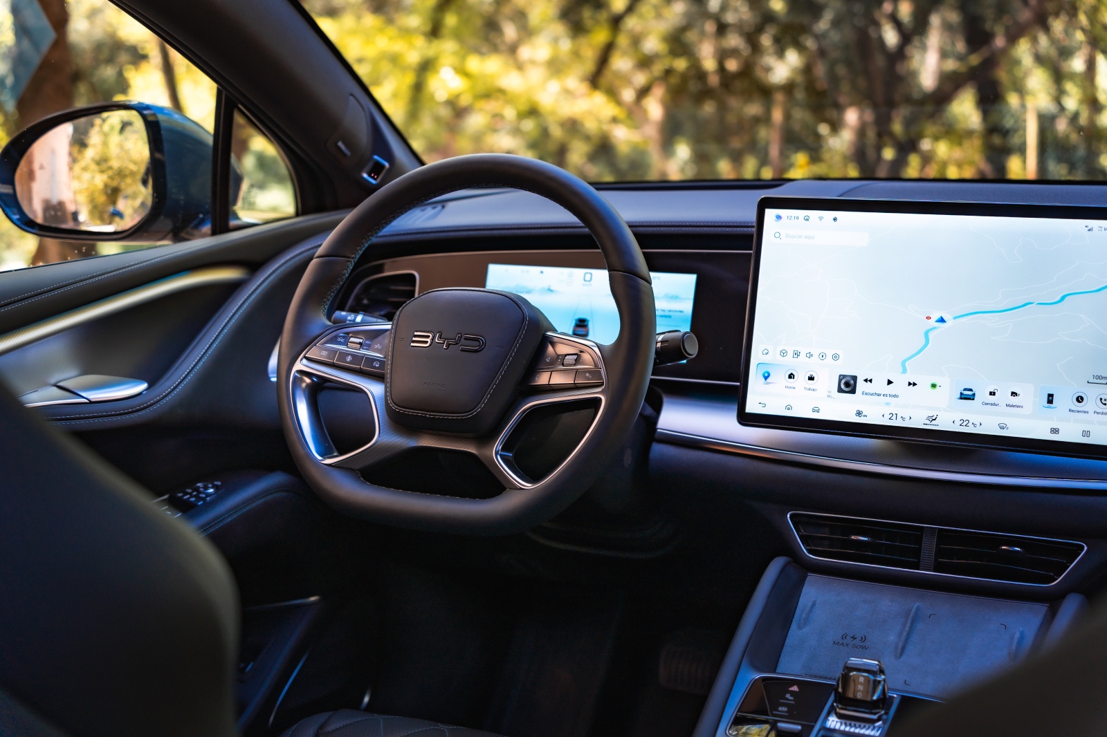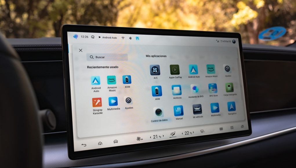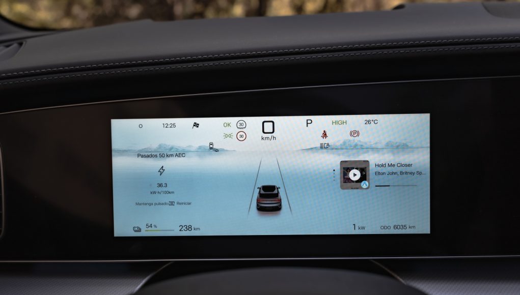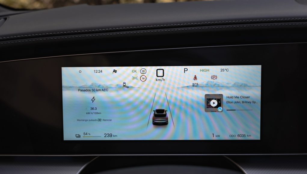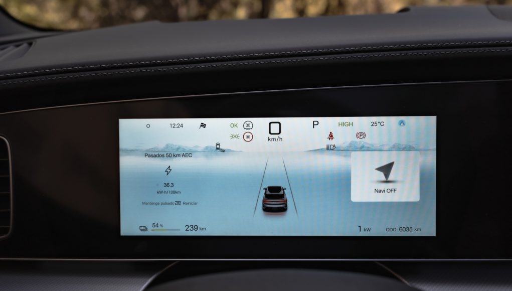 Tras el volante aparece un cuadro digital de 12,3″ que permite muy poca personalización pero que ofrece bastante información para la conducción, como consumo instantáneo, reparto de par y estado térmico. A nivel de conectividad, desde la APP de BYD a través de nuestro smartphone se pueden abrir y cerrar puertas, bajar las ventanillas, activar el climatizador o la calefacción, además de consultar tiempo de carga y autonomía restante, además de la opción de permitir el acceso al coche mediante NFC.