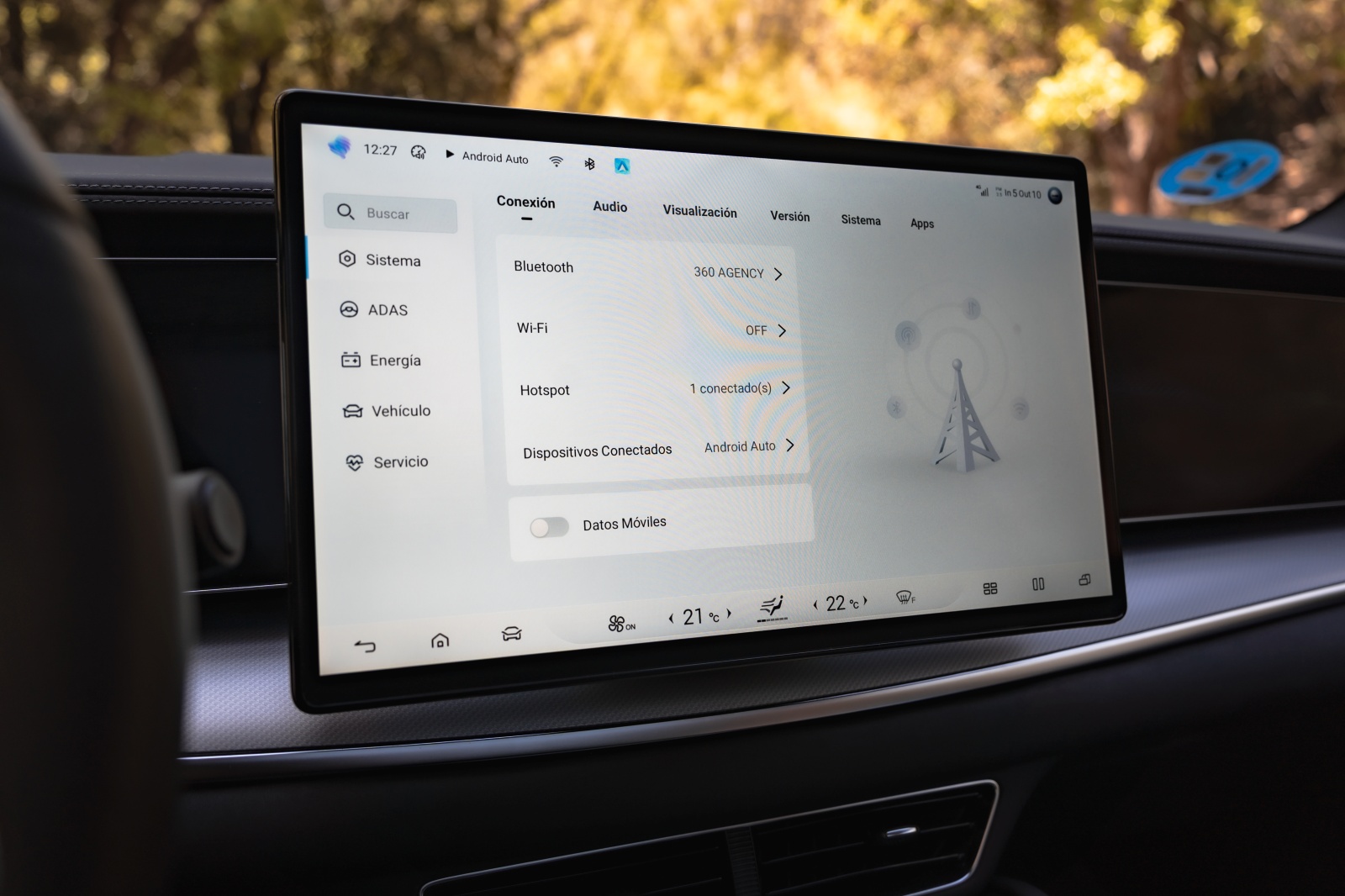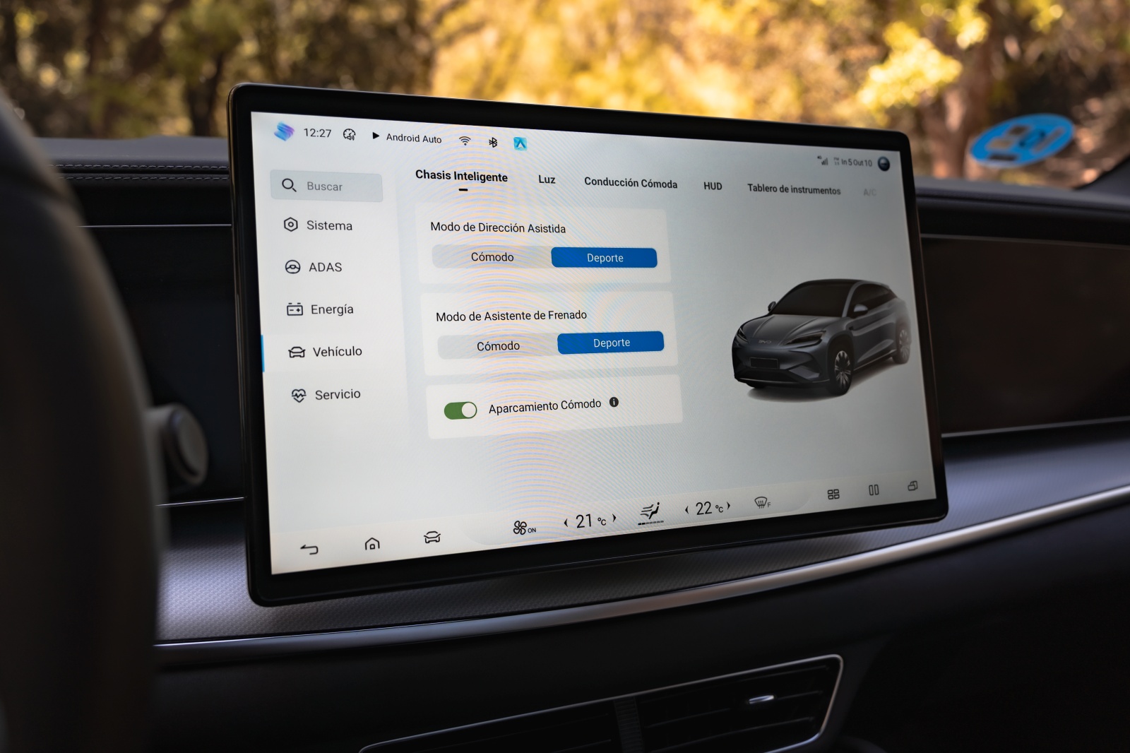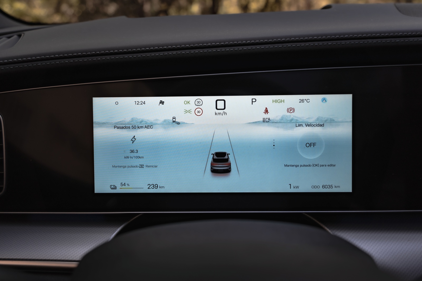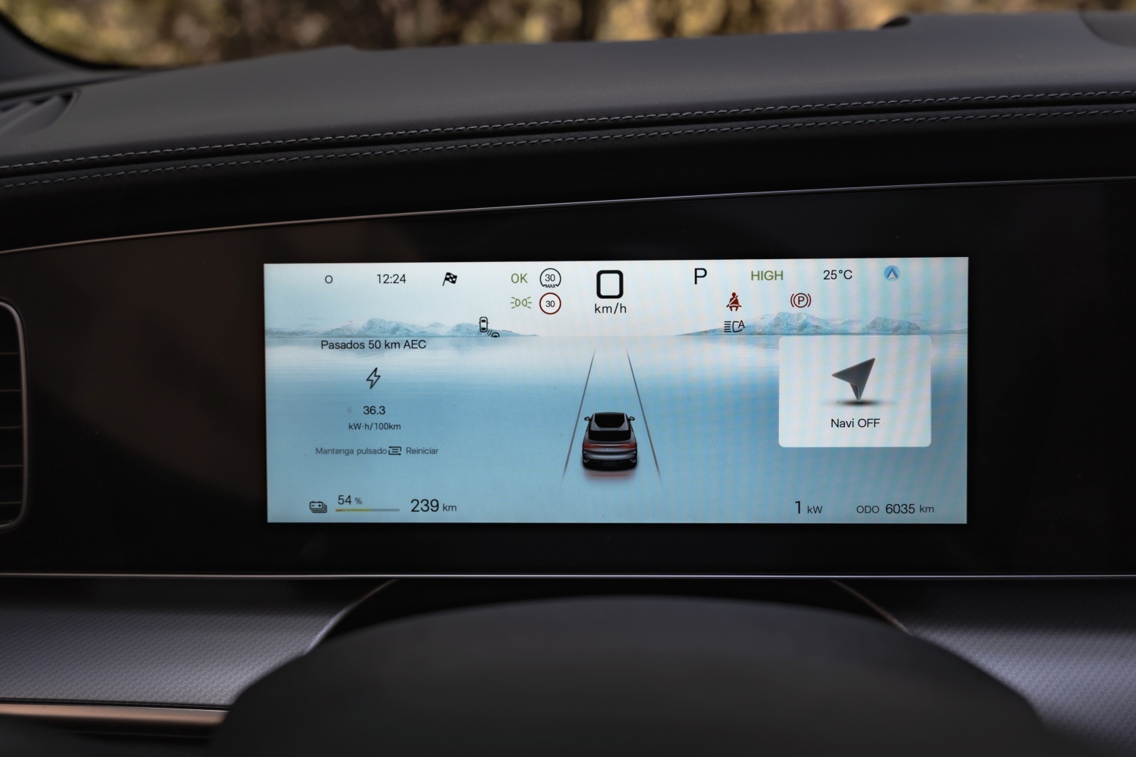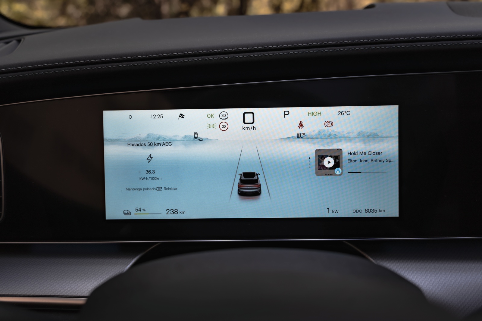 Tras el volante aparece un cuadro digital de 12,3″ que permite muy poca personalización pero que ofrece bastante información para la conducción, como consumo instantáneo, reparto de par y estado térmico. A nivel de conectividad, desde la APP de BYD a través de nuestro smartphone se pueden abrir y cerrar puertas, bajar las ventanillas, activar el climatizador o la calefacción, además de consultar tiempo de carga y autonomía restante, además de la opción de permitir el acceso al coche mediante NFC.