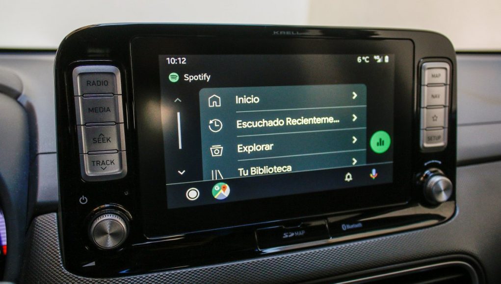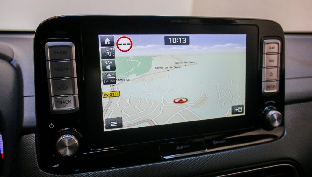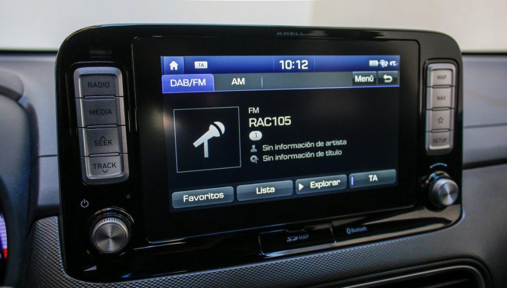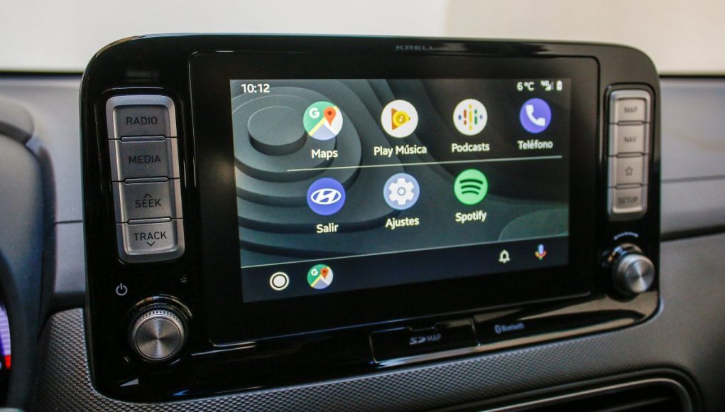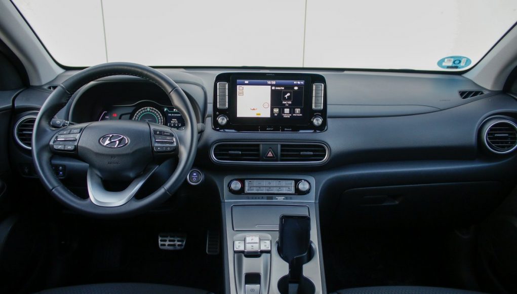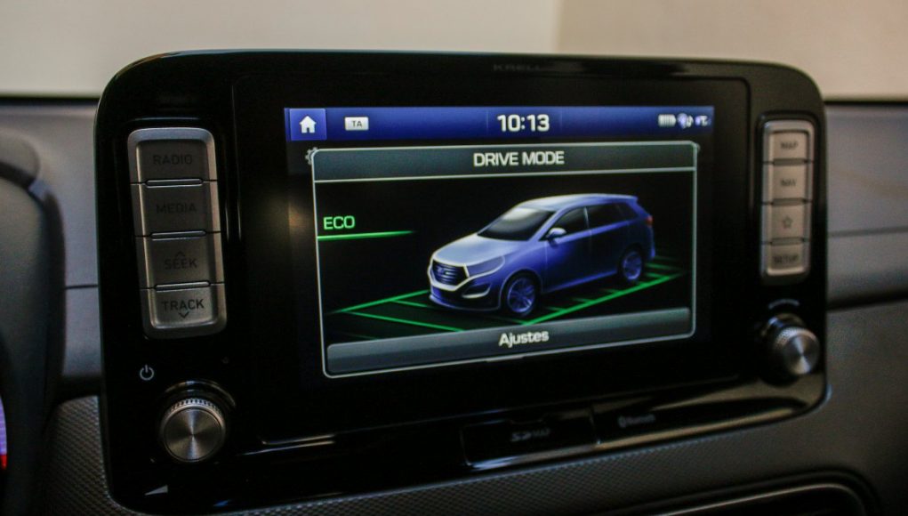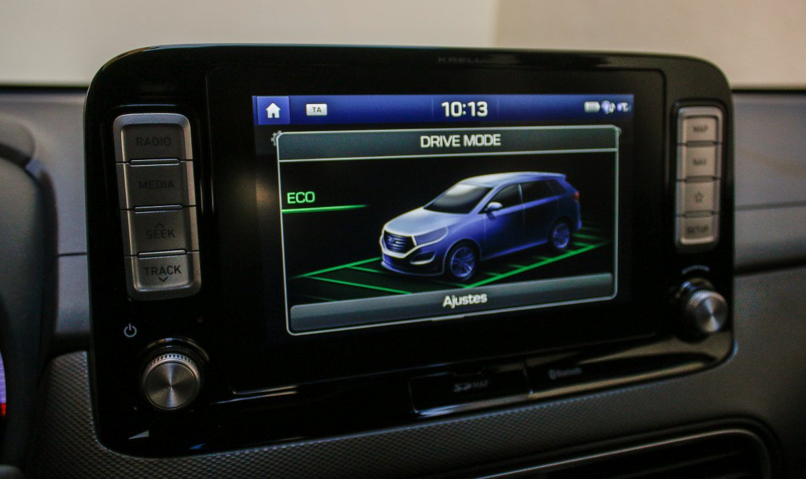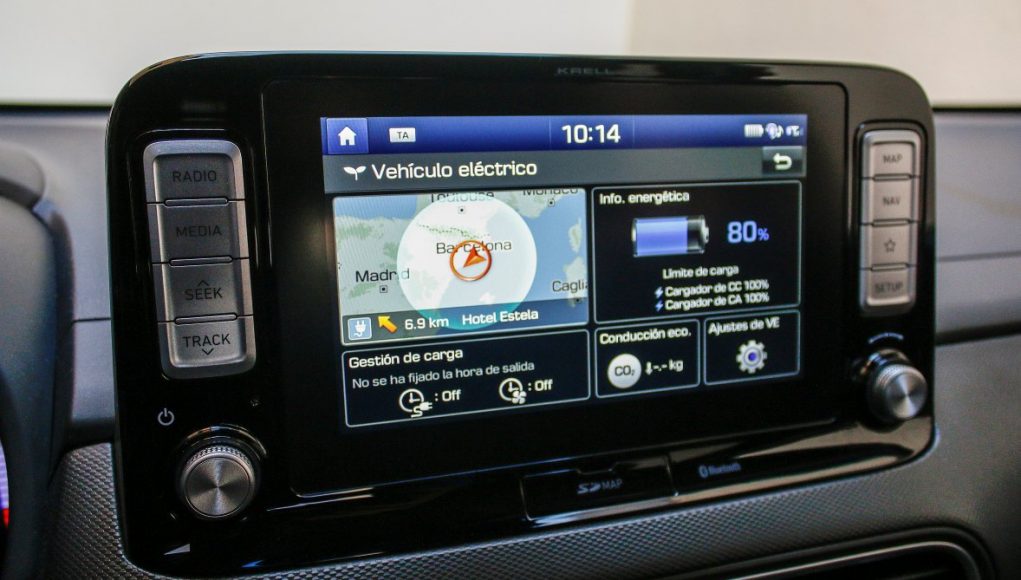 En la parte más alta de la consola central encontramos una pantalla táctil LCD de 8”, desde la que se controla todo el sistema de infoentretenimiento y que es compatible con Apple CarPlay y Android Auto, así como el navegador o los diferentes indicadores del sistema eléctrico. Destacar que si en el navegador seleccionamos un destino que pudiera estar fuera del alcance la autonomía de la batería, este nos dará un aviso de que tendremos que parar a cargar el coche para poder alcanzarlo. De serie el KONA eléctrico incluye una suscripción de 7 años a los servicios LIVE de la marca, que ofrece en tiempo real información sobre el tráfico, los radares o la información meteorológica.