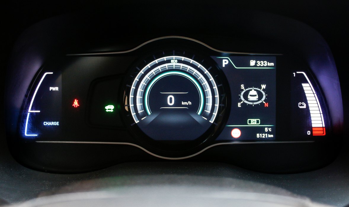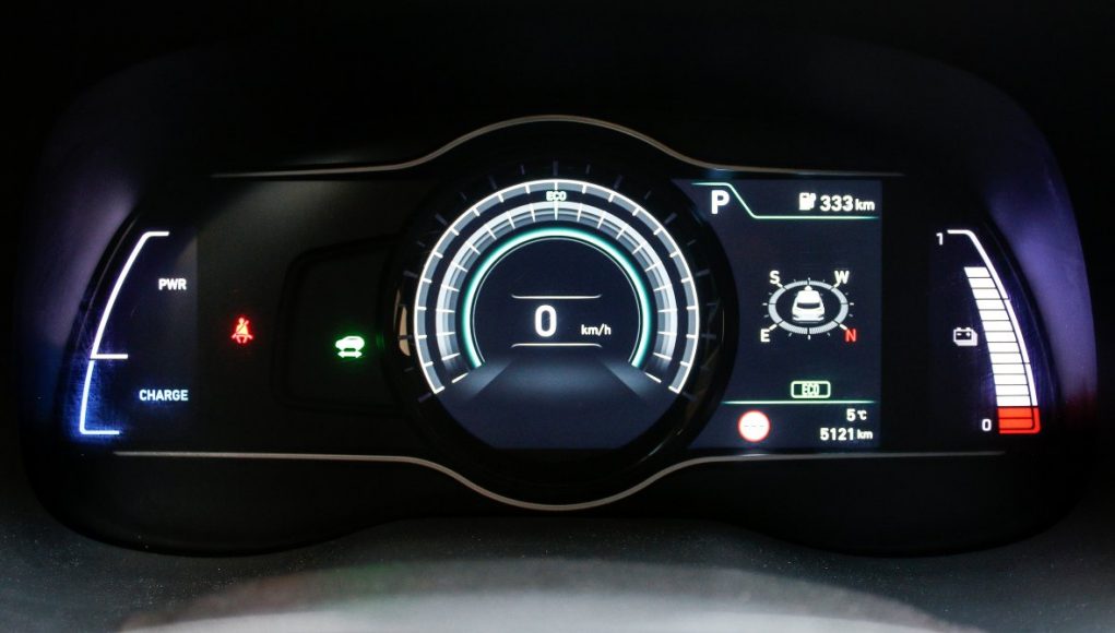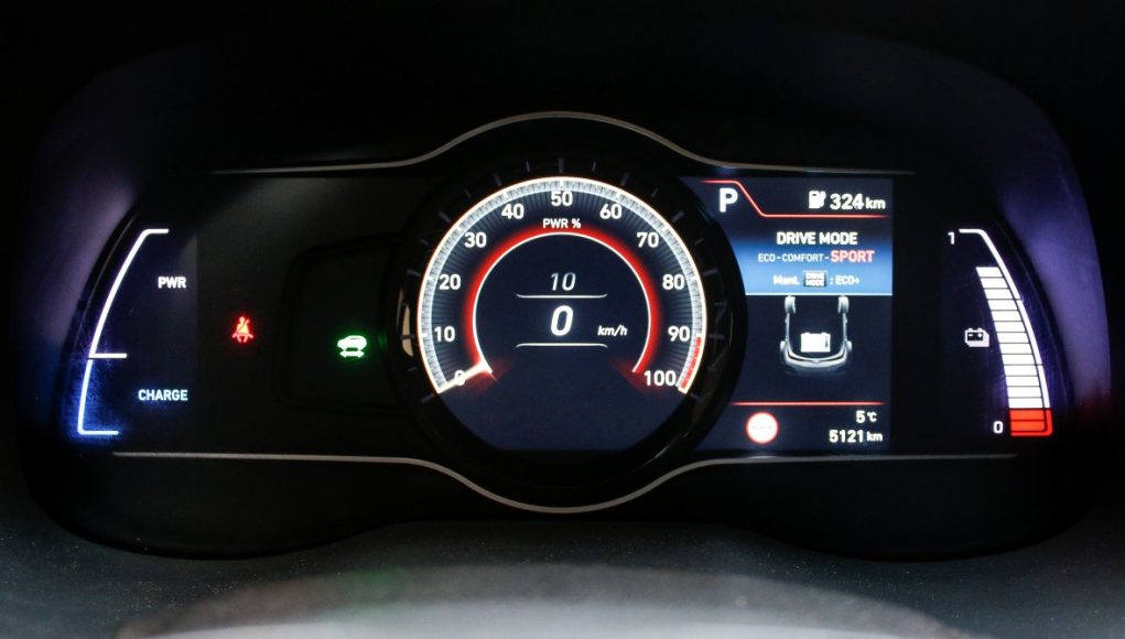 El habitáculo del KONA se presenta en dos acabados, uno de ellos de tres tonalidades grises, que quizás le den un toque más informal o bien en tonos negros como el de nuestra unidad de pruebas. Tras el volante multifunción encontramos el nuevo cuadro digital representado en una pantalla de 7”, que incorpora toda la información necesaria para la conducción, así como los diferentes indicadores del consumo de la batería o un útil gráfico del fluido de la energía. En función del modo de conducción seleccionado el color de las grafías cambia utilizando el verde para el ECO o el rojo para el Sport.