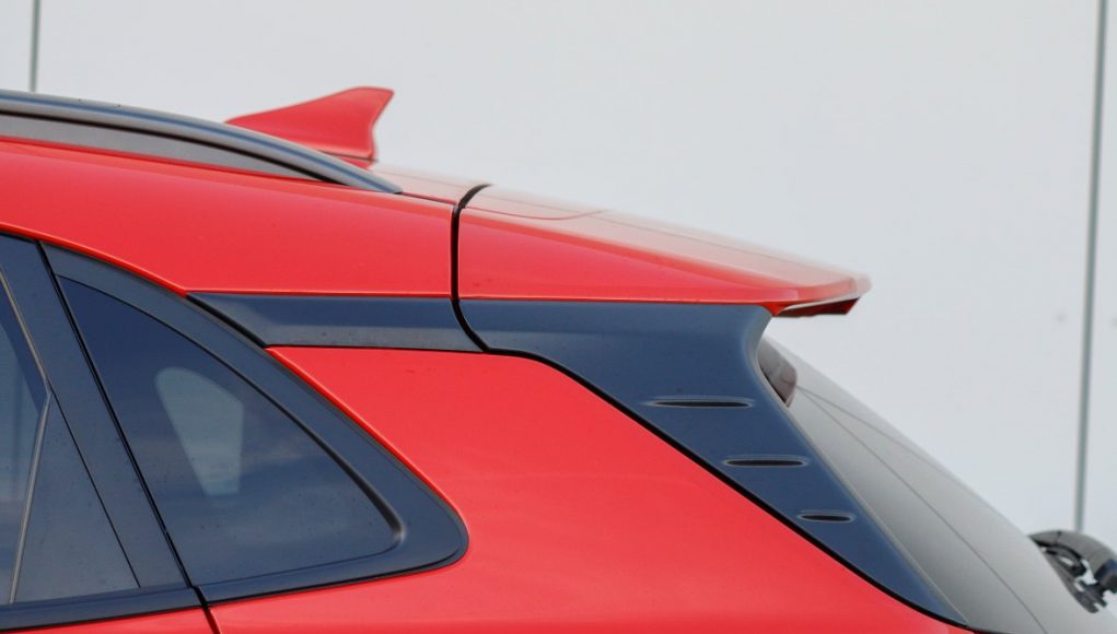 La vista lateral del KONA es quizás la que más muestra el esmerado diseño de este SUV, donde destaca la línea del final del techo con un pequeño deflector, así como el pequeño voladizo trasero. Las llantas de 17” han sido diseñadas específicamente para esta versión eléctrica en las que su diseño apenas deja huecos para que se cuele aire por ellas. En la zaga encontramos exactamente el mismo diseño que en el KONA de combustible, donde destacan los pilotos dotados de tecnología LED, partidos por el portón del maletero, así como la tercera luz de freno que está integrada en el alerón.