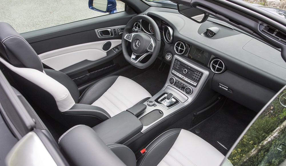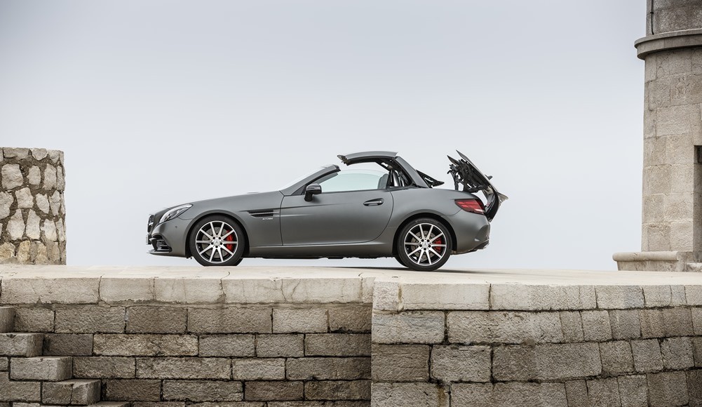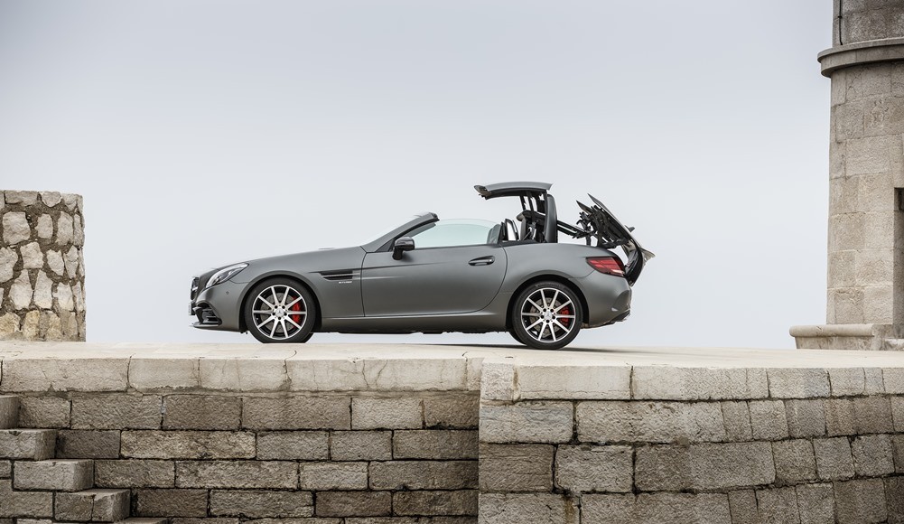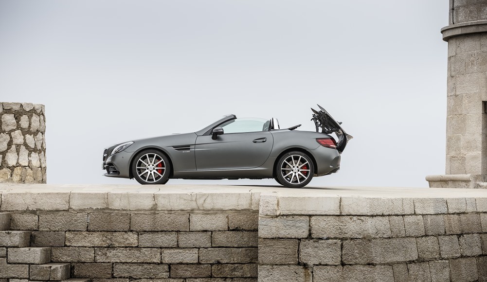 El techo retráctil del SLC conjuga el placer de conducir a techo descubierto con un confort ilimitado bajo condiciones meteorológicas adversas. El manejo de este techo de accionamiento electrohidráulico resulta ahora todavía más confortable. Si la situación en el tráfico obliga al conductor a ponerse en marcha durante la secuencia de apertura o cierre, es posible proseguir este proceso, iniciado con el vehículo detenido, hasta una velocidad aproximada de 40 km/h. Otra novedad es el estor cubreequipajes parcial semiautomático (en combinación con los equipos opcionales accionamiento de confort para el techo retráctil o KEYLESS-GO). Si el estor se encuentra en la posición superior para aprovechar mejor el volumen en el maletero, se desplaza automáticamente hacia abajo al abrir el techo.