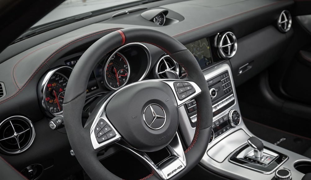 En el proceso de reestilización, los diseñadores de Mercedes-Benz han acentuado aún más el carácter deportivo de este roadster de culto. A esto contribuye especialmente el nuevo frontal. La parrilla del radiador erguida realza la forma del capó aflechado. Todos los SLC salen de fábrica con parrilla de efecto diamante. Las medidas de reestilización redundan en una sensación de mayor calidad en su habitáculo. Algunos elementos destacados son las nuevas molduras de aluminio claro (de serie) u oscuro con rectificado en efecto fibra de carbono. También se ha rediseñado el cuadro de instrumentos.