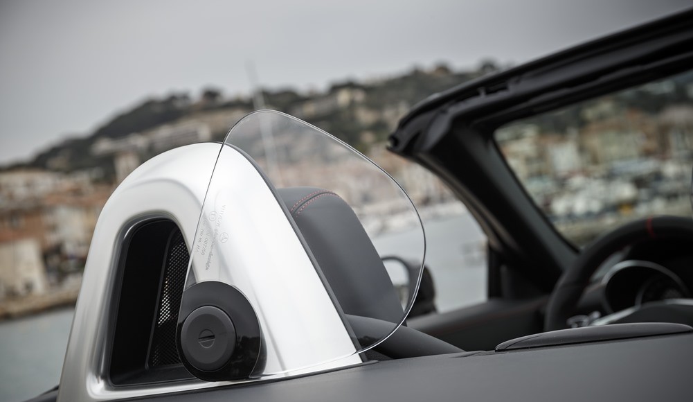 Si el cliente lo desea, puede disfrutar de un máximo confort climático cuando circula con el SLC abierto. De esto se encargan los asientos calefactados y AIRSCARF, la calefacción integrada en los reposacabezas delanteros, cuyo efecto puede potenciarse con uno de los dos paravientos disponibles. La ventanilla lateral situada detrás de la puerta puede cerrarse por separado estando el techo abierto. De este modo se atenúa el ruido aerodinámico.