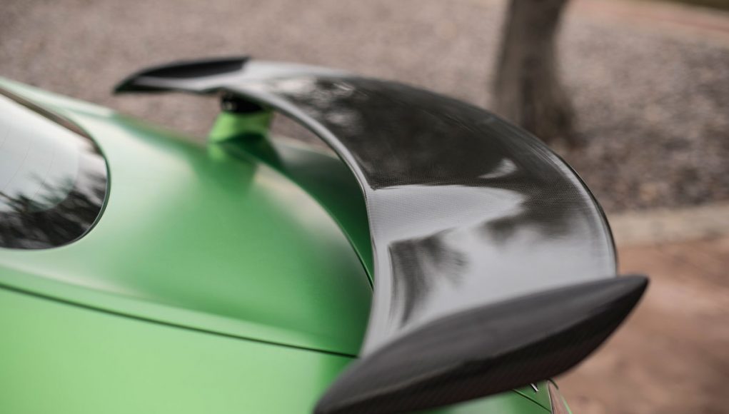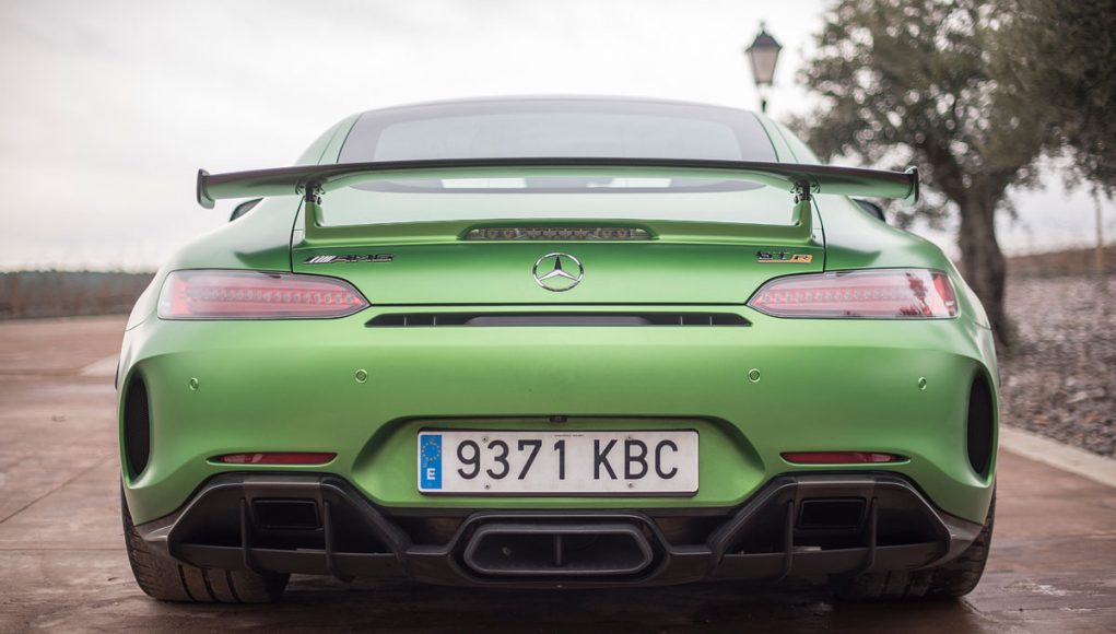 En la parte trasera encontramos un difusor trasero doble, así como un spoiler regulable manualmente situado en el portón del maletero y un nuevo fondo plano que recorre todos los bajos del coche. Con todos estos elementos con respecto a un GT estándar, el GT R ofrece 155 kg de carga extra a su velocidad máxima. Y rebaja el coeficiente aerodinámico con respecto a un AMG GT hasta un Cx de 0,35.