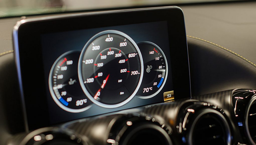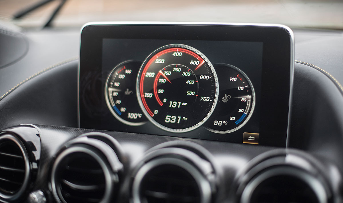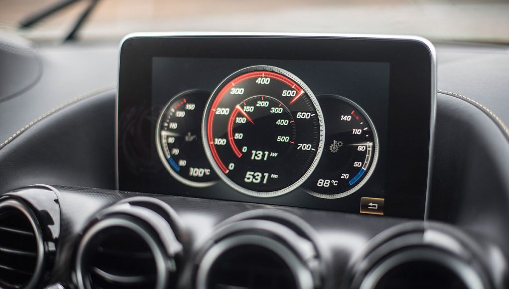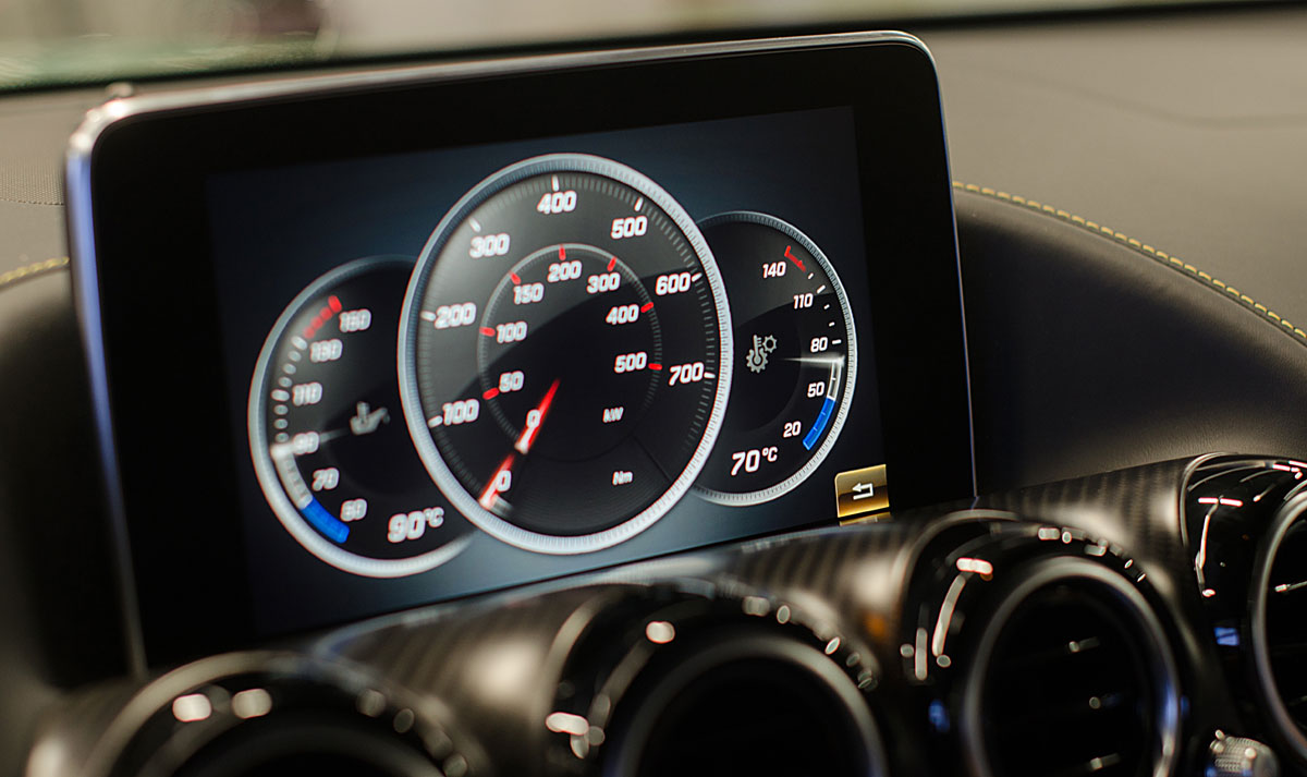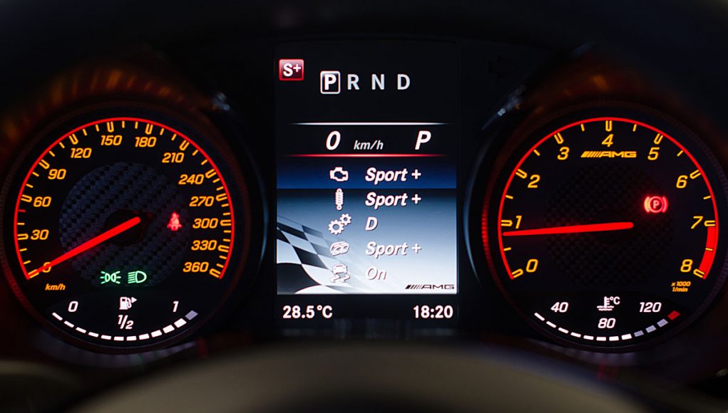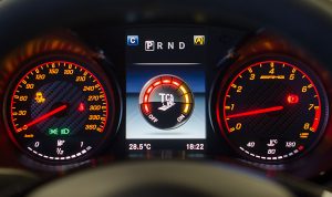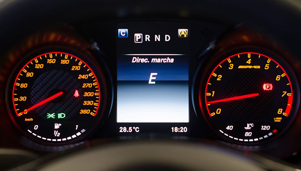 El volante multifunción, tiene un grosor y tamaño acertado para un coche con estas connotaciones deportivas e integra en la parte trasera las levas para accionar el cambio de forma secuencial. Tras este, encontramos dos esferas que par nuestra suerte son analógicas, de las antiguas, con agujas reales que se acompasan la una con la otra cuando vas tomando velocidad, y que están separadas por una pantalla TFT desde la que podemos ver representada la información de la navegación, el ordenador de abordo el modo de conducción que llevamos activado o bien información específica AMG.