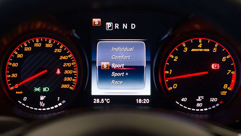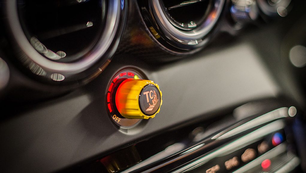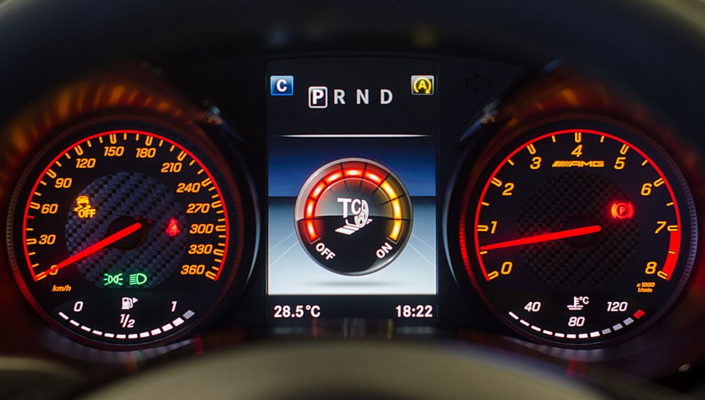 Bajo esta pantalla, encontramos lo que sin duda es el “mando mágico” de este coche el AMG TRACTION CONTROL, que se activa a través de un potenciómetro con el que se cambia o más bien podemos eliminar el control de tracción, y que dispone de 9 posiciones para poder tener a nuestra disposición los 585cv bajo el único control del pedal de acelerador. Hay que destacar que, para poder activar esta función, primero hay que desconectar el control de estabilidad, por lo que su uso queda prácticamente recomendado para el uso en circuito y no en carretera. Os podemos asegurar que este coche sin controles, y bajo la lluvia como él fue el caso del día que llevamos a cabo la prueba, es casi ingobernable por muchas manos que tengas al volante.