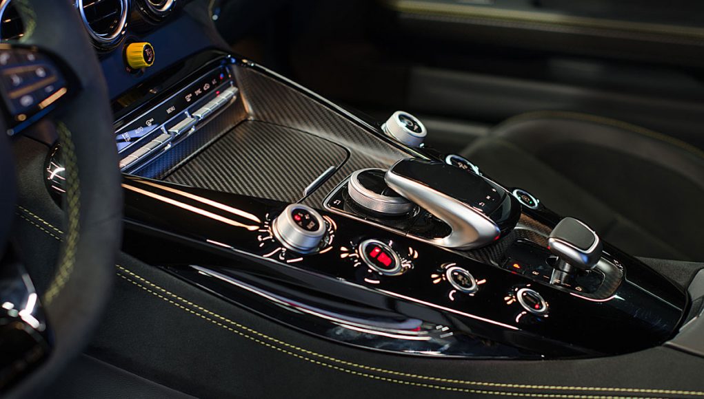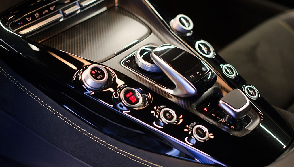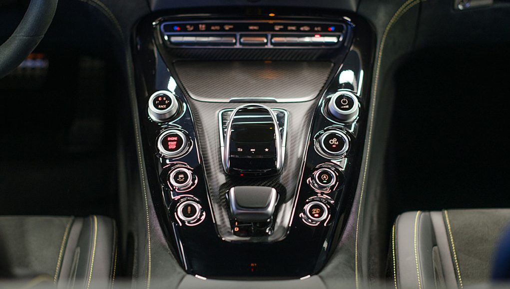 La consola central, agrupa los mandos del AMG Dynamic Select, el botón para activar el sonido más agudo del escape, el selector de la dureza de la suspensión o el desconector del control de estabilidad y tracción.