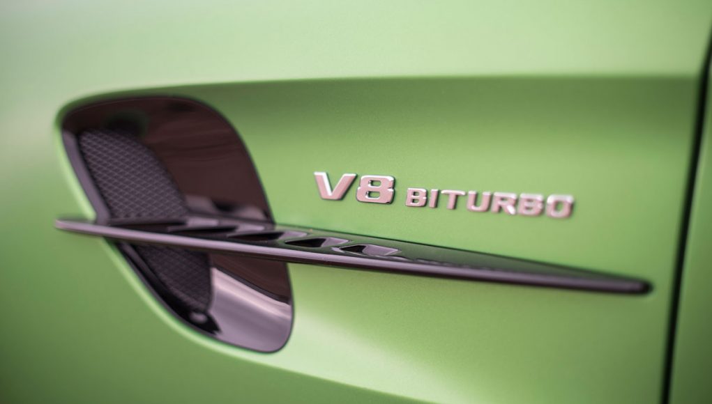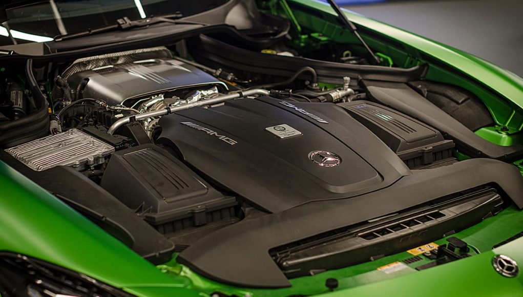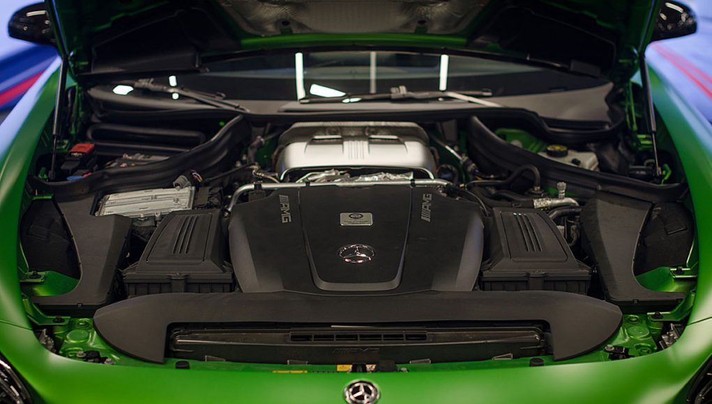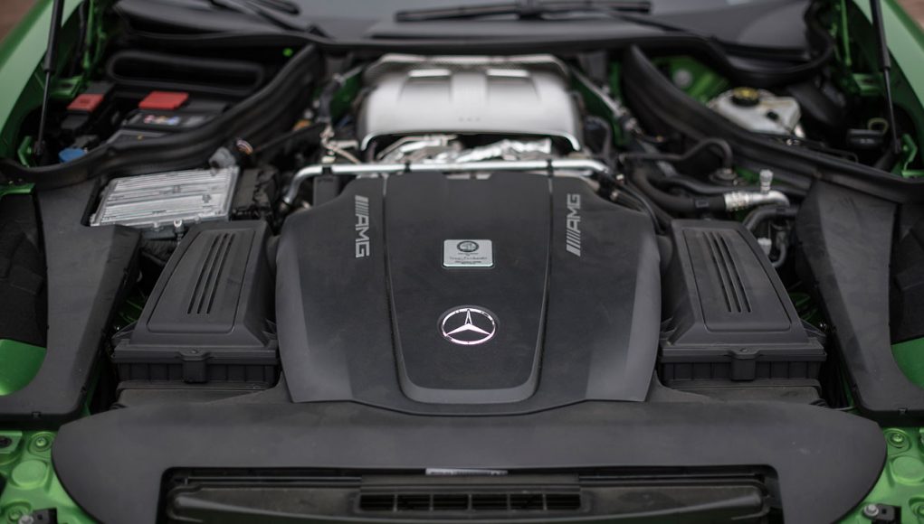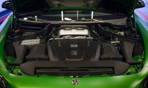 Bajo el alargado y afilado capó delantero, encontramos una mecánica conocida y compartida con el resto de la gama AMG GT. Hablamos del bloque de 4 litros V8 biturbo situado en posición central-delantera, que en este modelo rinde 585 cv a 6.250 rpm y un par máximo de 700 Nm ente las 1.99 y las 5.500 vueltas. El aumento de potencia desde los 522 cv del AMG GT S hasta los hasta los 585 cv se debe a una electrónica específica, una relación de compresión que ha sido modificada y a un mayor soplado de los turbos que pasa de los 1,2 bares a 1,35. Para el sistema de lubricación se ha recurrido a un cárter seco, lo que ha permitido situar todo el bloque en una posición más baja lo que se traduce en un centro de gravedad más bajo.
