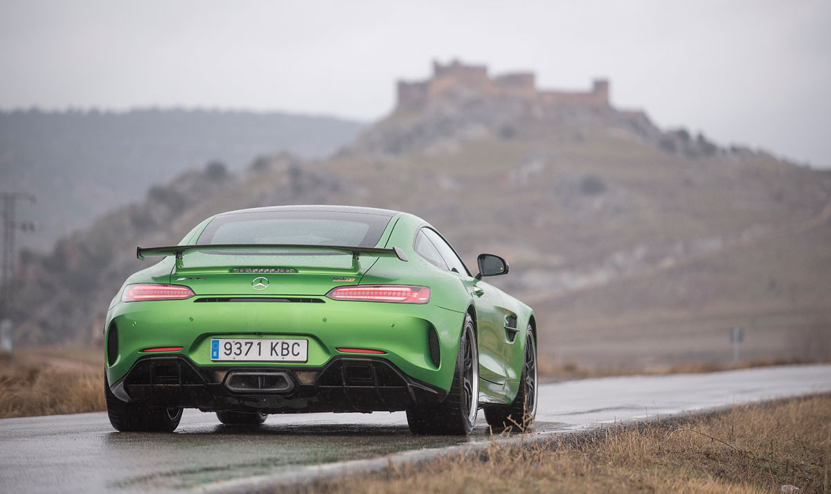 Tomamos un desvío que nos llevaría a la Finca Río Negro, una pequeña bodega que se dedica a producir vinos de altura, situada a escasos kilómetros de Cogolludo. Para llegar allí, encontramos una revirada carretera en la que pudimos durante un rato, y digo durante un rato, porque empezó a llover, comprobar el comportamiento dinámico del AMG GT R, en un tramo en el que las curvas se sucedían una tras otra y en la que comprobamos el increíble trabajo que Mercedes y AMG han llevado a cabo con este coche. Todo en él está pensado para devorar curvas, para ir guiado sobre raíles, salvo en el caso en el que empieces a jugar con la electrónica o con el botón amarillo y el control de tracción, entonces empezarás a ver el carácter subvirador que tiene un coche de este talante con 700 Nm de par y tracción al tren trasero.