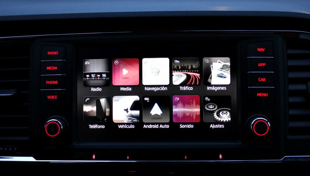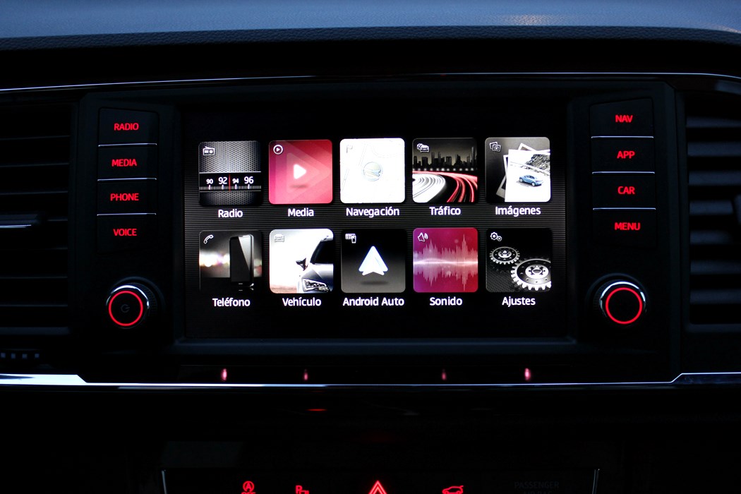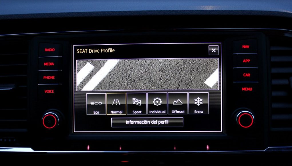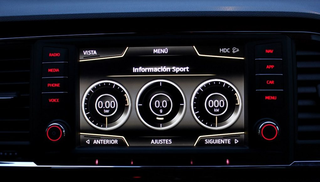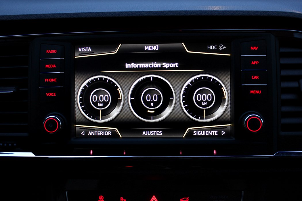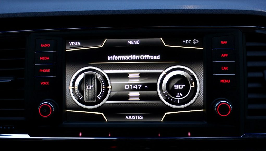 Desde esta pantalla se maneja todo el sistema de infoentretenimiento, el navegador y a través del Mirror Link nos podemos conectar a nuestro smartphone para así permitir, por ejemplo, escuchar música a través de Spotify o navegar a través de Google maps. El sensor de aproximación hará emerger cuando acerquemos la mano, un menú en la parte inferior, en función de lo que estemos usando. El sistema de modos de conducción también se representa en esta pantalla, así los datos de conducción eficiente, o unos indicadores deportivos o del uso off-road.