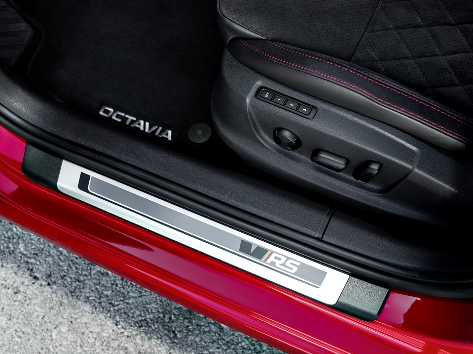 Interior con asientos deportivos de Alcantara® /Cuero El interior predominantemente negro del ŠKODA OCTAVIA RS 245 y el ŠKODA OCTAVIA COMBI RS 245 impresiona no sólo por sus generosas dimensiones y gran claridad, sino también por sus materiales de alta calidad. Con sus laterales altos y reposacabezas integrados, los asientos deportivos en Alcantara®/Cuero proporcionan un máximo apoyo en curvas rápidas. Los asientos delanteros llevan el logotipo RS – al igual que los umbrales de las puertas delanteras. El asiento del conductor tiene costuras rojas o grises, es ajustable eléctricamente, ofrece soporte lumbar y tiene una función de memoria que almacena tres posiciones distintas.