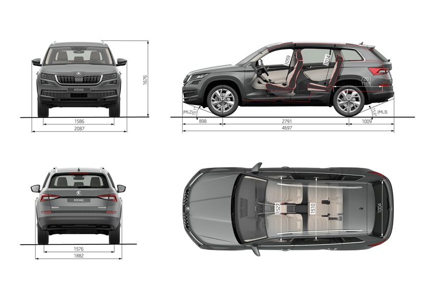Con sus dimensiones, el KODIAQ está en la zona alta del segmento de los compactos. Mide 4,697m de largo, 1,882m de ancho, 1,676m de alto (incluyendo las barras del techo) y tiene una distancia entre ejes de 2,791m. Está basado en la matriz modular transversal (MQB) del grupo Volkswagen en la que la ligereza en la construcción juega un papel importante. En el chasis, la utilización de láminas metálicas estampadas en caliente forman una columna vertebral ultra-fuerte. La versión de entrada con el motor TSI y la tracción delantera pesa 1.452Kg en vacío (sin conductor) y la TSI 1.4 con tracción total 1.540.