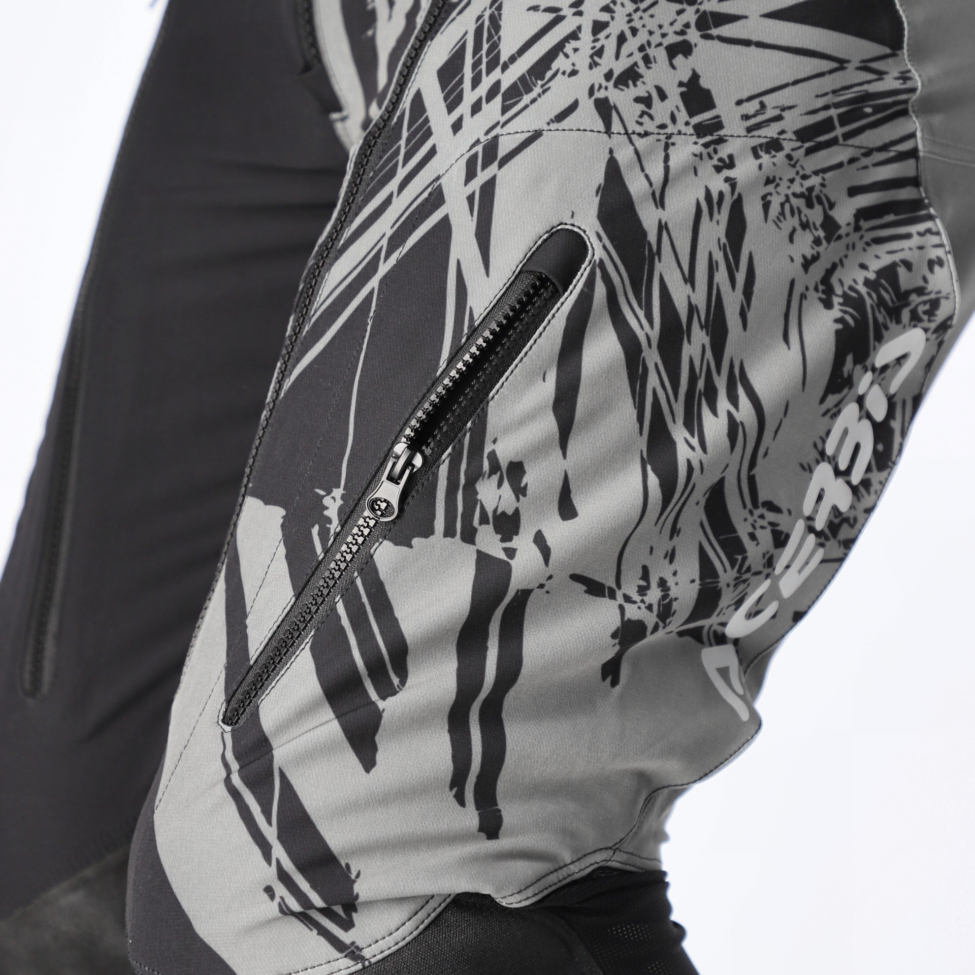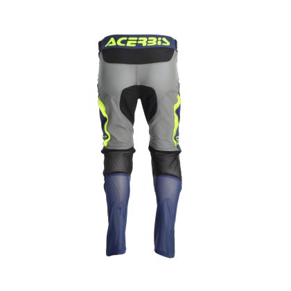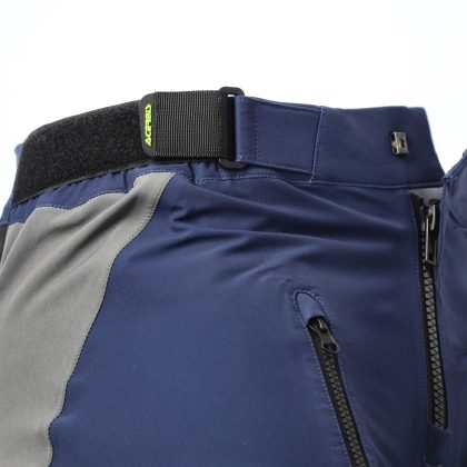 Los pantalones, repelentes al agua y aptos para su uso durante tres estaciones, están disponibles en los colores azul/amarillo y negro/gris, con una amplia gama de tallas desde la 30 hasta la 40. Los logotipos de Acerbis, con inserciones de silicona, aparecen en la parte delantera y trasera, lo que demuestra la atención al detalle y al diseño que caracteriza a la marca Acerbis.