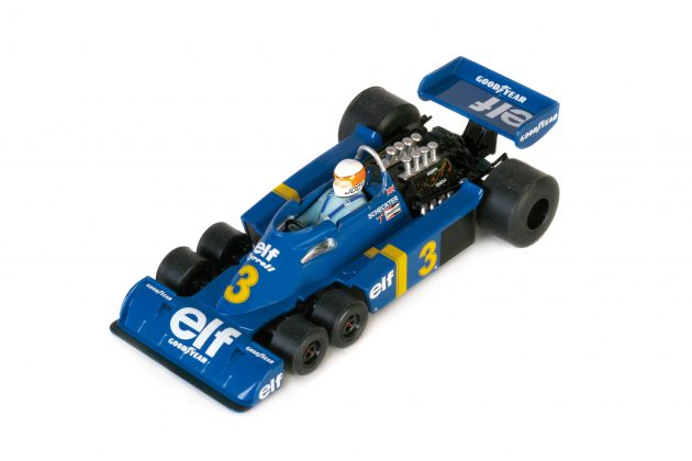 Otro de los coches que ofrece el set es el Tyrrell P34 de Jody Scheckter. La escudería británica Tyrrell estuvo presente de manera ininterrumpida en el Mundial de F1 desde el año 1970 hasta el 1998, y fue en el año 1976 cuando presentó un coche con seis ruedas, cuatro ruedas frontales de 10 pulgadas, logrando con Scheckter en el GP de Suecia, la única victoria hasta el momento de un coche de este tipo.