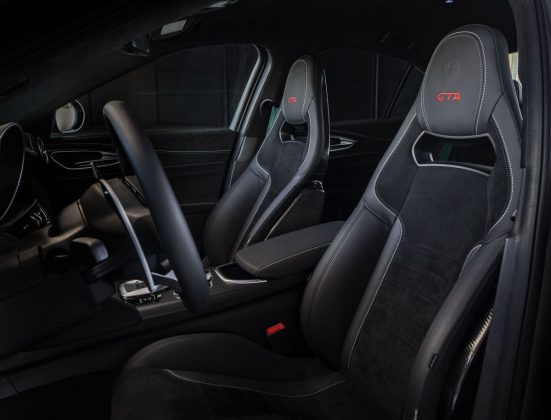 Además, la ligereza del material, en combinación con la fibra de carbono, da como resultado una considerable disminución general en el peso del automóvil en comparación con otros materiales, lo que mejora el rendimiento general del coche. Por esta razón, el uso de Alcantara está aún más extendido en el GTAm, donde la eliminación del banco trasero deja espacio para compartimentos específicos, también tapizados en Alcantara, destinados a albergar cascos y un extintor. Las costuras en contraste del color de la carrocería y el logo GTA bordado en rojo Alfa Romeo acentúan el espíritu de carreras del automóvil.