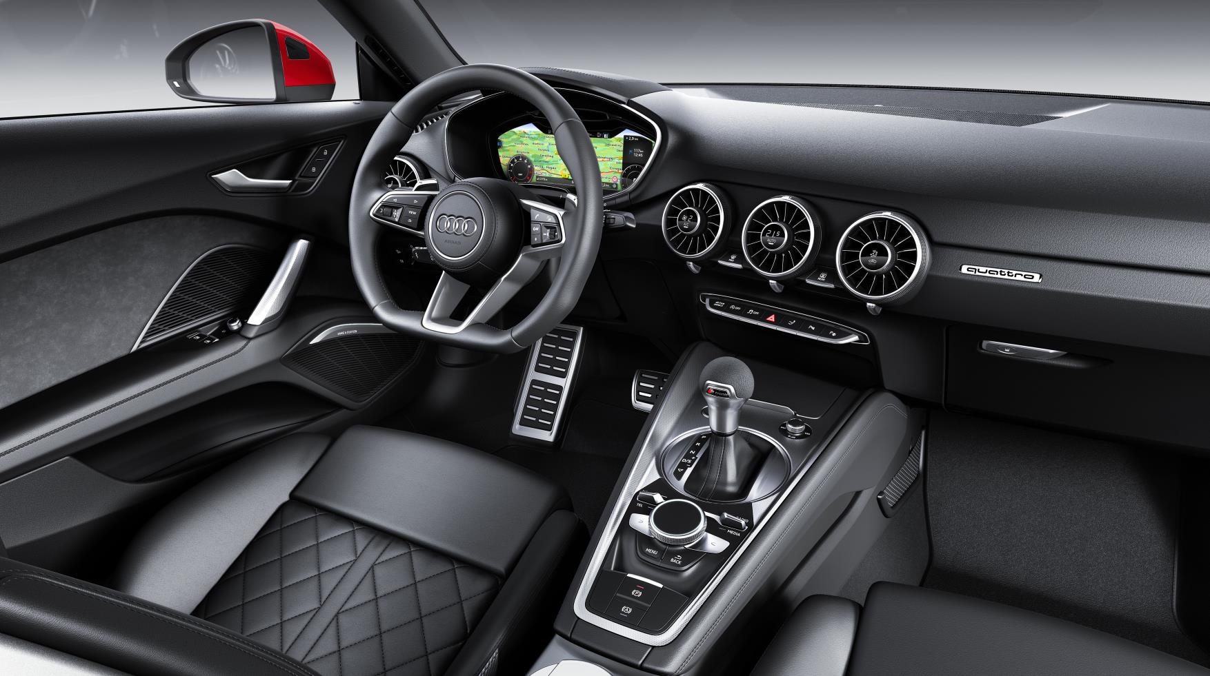 Desde la versión básica, el Audi TT incluye el Audi drive select. El conductor puede controlar todas las funciones del sistema de infotainment y el control por voz a través del volante multifunción. Los menús aparecen en el Audi virtual cockpit, en el que se puede elegir entre dos vistas diferentes. En todas las versiones, se pueden conectar dispositivos móviles como smartphones mediante un USB iluminado, o haciendo uso del bluetooth.