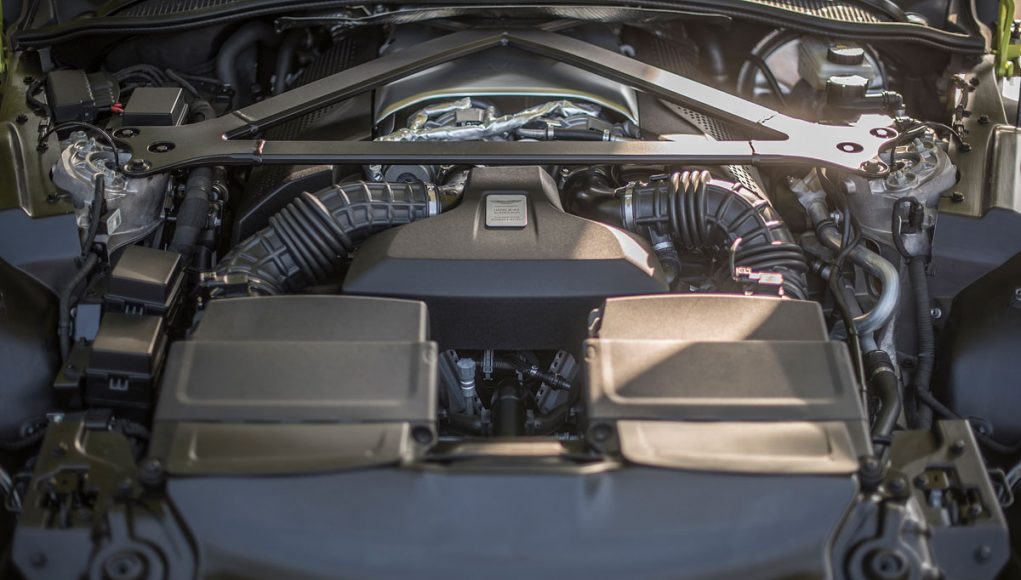 El propulsor del Vantage es un V8 de 4.0 litros de cilindrada está sobrealimentado por 2 turbos. Desarrolla una potencia 510 CV a 6.000 rpm y entrega 685 Nm desde 2.000 hasta 5.000 rpm. Este V8 va asociado a un cambio automático de ocho relaciones de origen ZF situado sobre el eje posterior (tipo transaxle). Aston Martin anuncia un 0 a 100 km/h en 3,5 segundos y una velocidad máxima de 313 km/h.