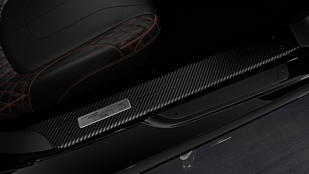 The first of these Designer Themes is a monochrome design that mates Ultimate Black paintwork – a nod to the first generation Vanquish S Ultimate Edition, for which this colour was first created – with Copper Bronze graphics around the front air intake, along the side sills and on the rear diffuser. Detailing includes black exhaust tailpipes, brake calipers, window trims and 5-spoke wheels, plus extensive use of carbon fibre for the bonnet louvres, front grille and side strakes. The interior features Obsidian Black leather with Chestnut Tan accents and stitching and carbon fibre twill facia.