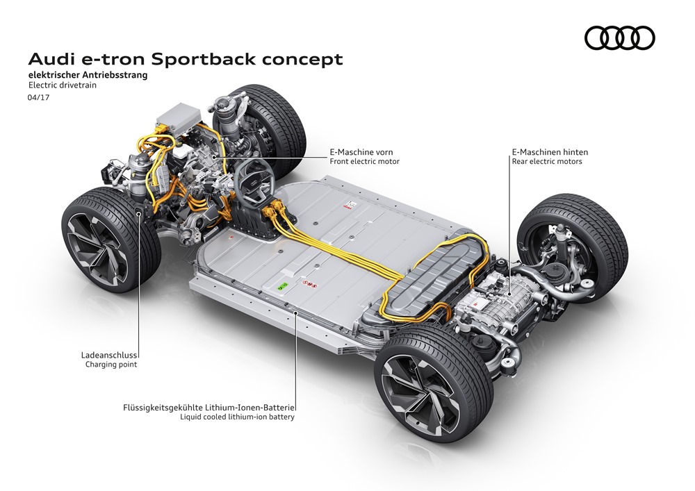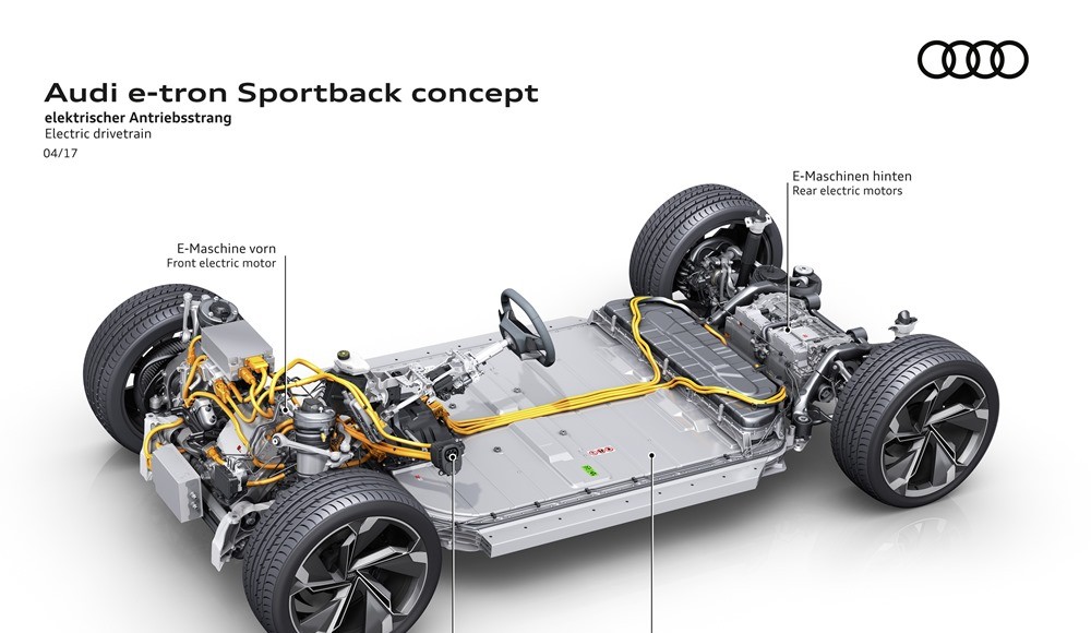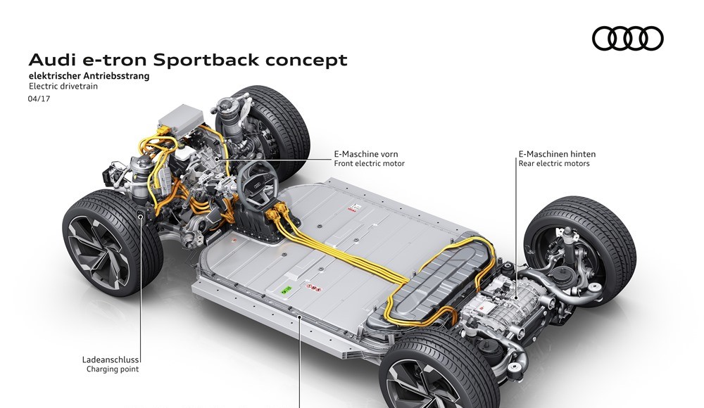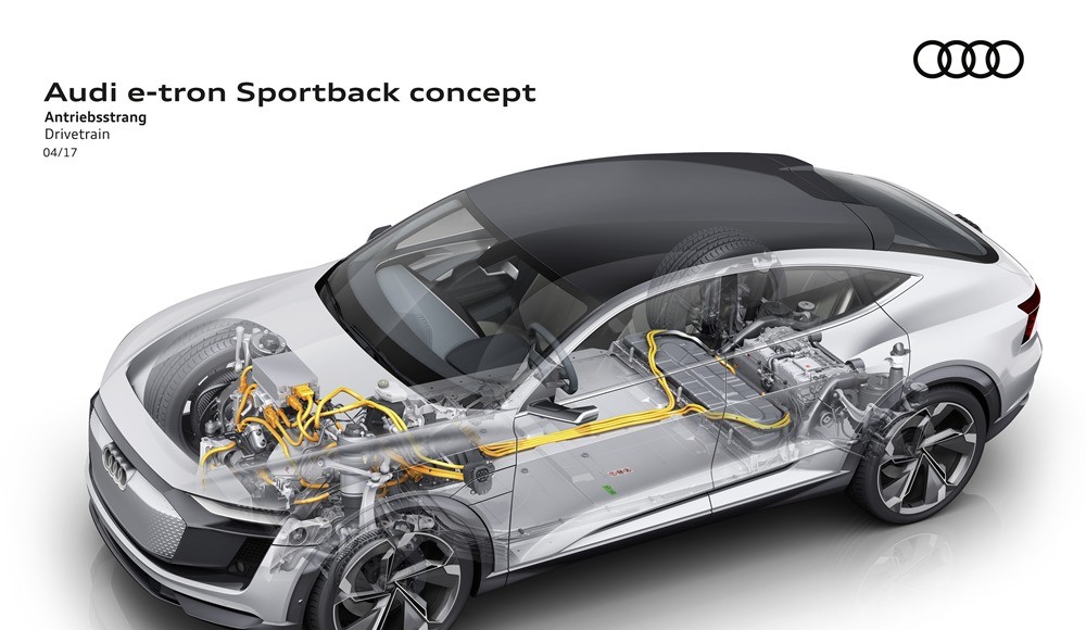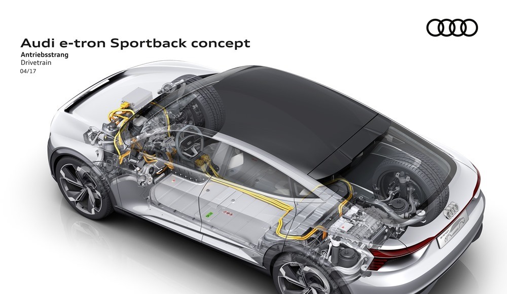 La marca de los cuatro aros mostró por primera vez la configuración con tres motores eléctricos en el concept-car Audi e-tron quattro presentado en el Salón de Frankfurt en 2015. Una configuración que ahora pasará a utilizarse en futuros modelos de producción, u que convierte al Audi e-tron Sportback en un vehículo eléctrico con tracción quattro, porque las cuatro ruedas entregan potencia al asfalto.