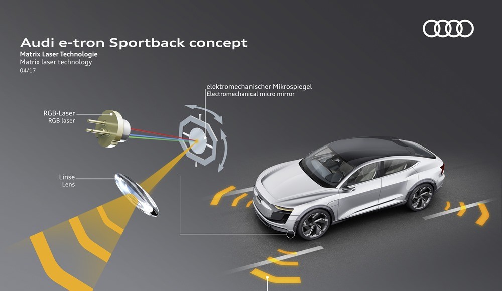 Hay pequeños proyectores láser Matrix en las cuatro esquinas del vehículo. Estos proyectores han sido preparados para actuar sobre la superficie de la carretera, por lo que pueden añadir una dimensión adicional a las señales dinámicas. Una de esas situaciones podría ser la de suprimir una señal de intermitencia, de manera que se enviaría un mensaje claro al resto de usuarios de la carretera. Con todos estos avances, Audi vuelve a asumir con el e-tron Sportback el papel de pionero en tecnologías de iluminación, y demuestra cómo las mejoras en seguridad vial se pueden combinar de forma efectiva con las tendencias de diseño.