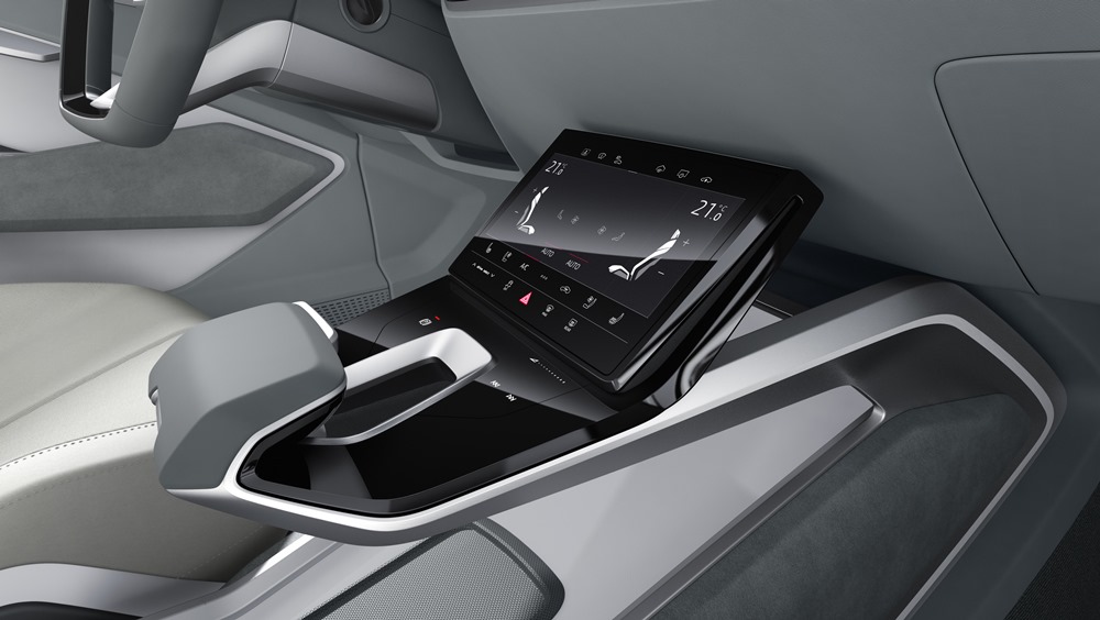 Para el interior, el Audi e‑tron Sportback concept aprovecha claramente todas las ventajas que ofrece un coche con un sistema de propulsión eléctrico a través de baterías. Las unidades de almacenamiento de energía van completamente escondidas por debajo del piso del vehículo y los motores eléctricos ocupan mucho menos espacio que uno de combustión tradicional, al que hay que añadir todos los elementos auxiliares para su funcionamiento y el voluminoso depósito de gasolina. Con los motores eléctricos separados entre los ejes delantero y trasero no es necesario utilizar un árbol de transmisión. Como resultado, la consola situada sobre el túnel central se puede posicionar sin estar condicionada por ninguna subestructura, y ahora parece ir suspendida entre los asientos del conductor y del pasajero. Este diseño enfatiza un espacio lleno de luz, y las aberturas que se originan en los elegantes elementos de apoyo se pueden aprovechar como huecos de almacenaje adicionales.
