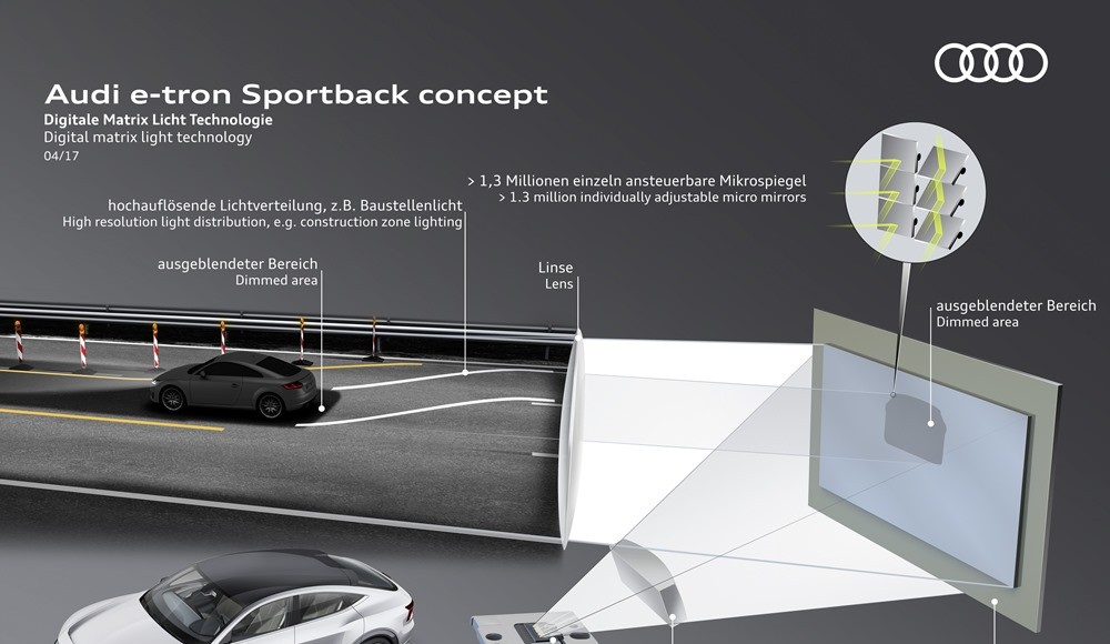 Estrechas tiras de luz a ambos lados y por debajo del capó delantero (las luces diurnas) se convierten en los ojos de este coche laboratorio. Gracias a una combinación de LEDs y a una superficie estudiada de microespejos, a las que se une una compleja tecnología de control, es posible crear un gran número de formas y movimientos animados. Cuando el e-tron Sportback arranca y también cuando las puertas están abiertas, el sistema utiliza segmentos conmutables para generar señales visuales dinámicas de bienvenida.