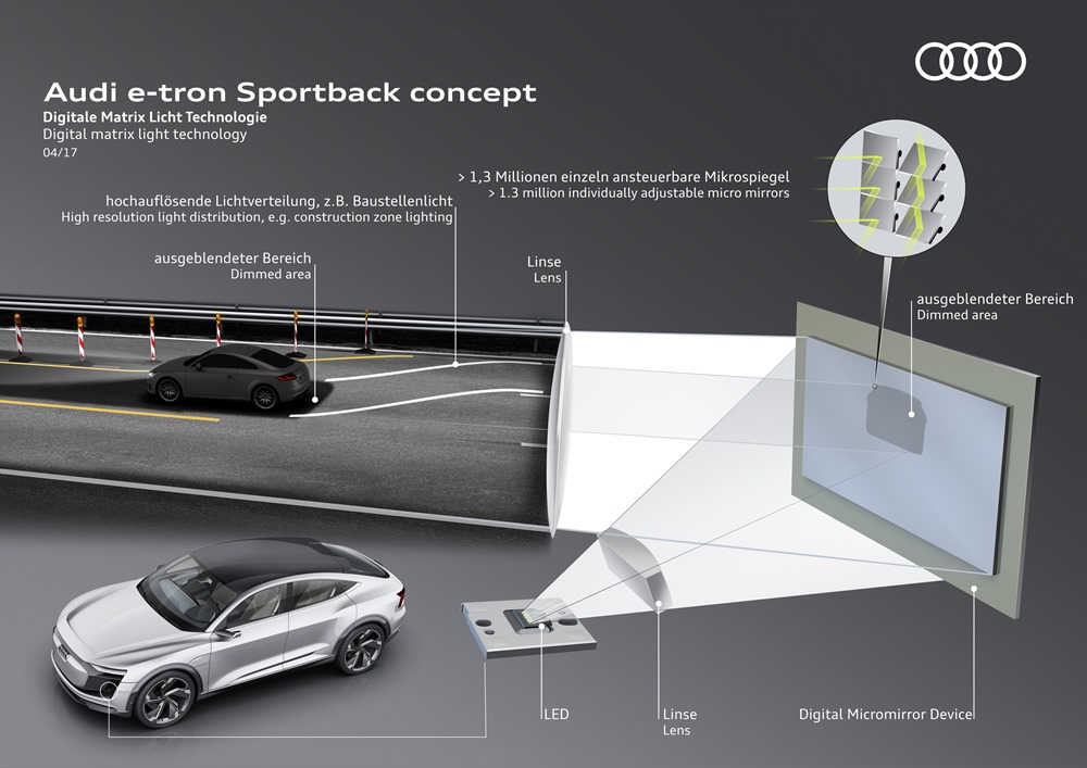 Con el e-tron Sportback concept, Audi abre otro capítulo de innovaciones en la tecnología de iluminación aplicada al automóvil. La marca de los cuatro aros fue la primera en el mundo en adoptar los faros completos de LED, además de dar un impulso importante a la tecnología Matrix LED, a la iluminación láser y a la tecnología OLED. El prototipo tecnológico que se muestra en Shanghái estrena ahora toda una serie de sofisticadas funciones, que llevan la visibilidad y la interacción con el entorno a una nueva dimensión.