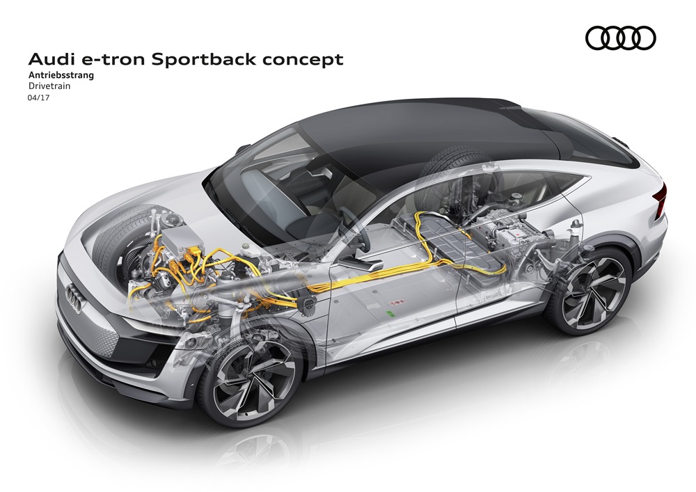 Para su conducción, el e‑tron Sportback utiliza una configuración que también va a ser adoptada en los futuros modelos de producción en serie de Audi, la propulsión cien por cien eléctrica: un motor eléctrico en el eje delantero y otros dos en el trasero mueven las cuatro ruedas, transformando a este coupé de altas prestaciones en un coche con tracción quattro, al más puro estilo Audi. Los 320 kW (435 CV) de potencia, que pueden llegar a ser 370 kW (503 CV) en el modo boost, proporcionan un excelente empuje, con una aceleración de 0 a 100 km/h que se realiza en sólo 4,5 segundos. La batería cuenta con una capacidad de 95 kW/h, y una autonomía que sobrepasa los 500 kilómetros en el ciclo homologado NEDC.