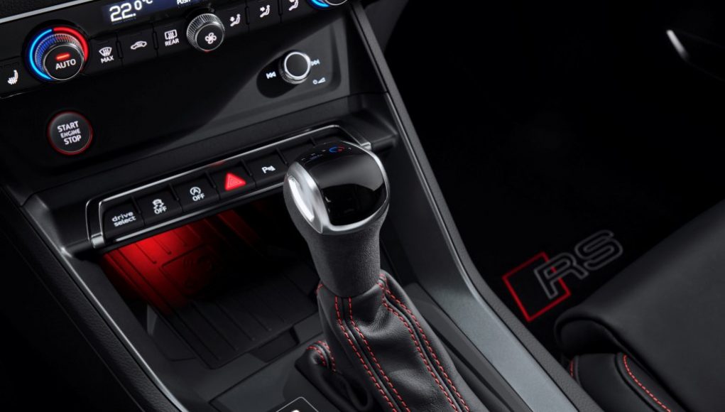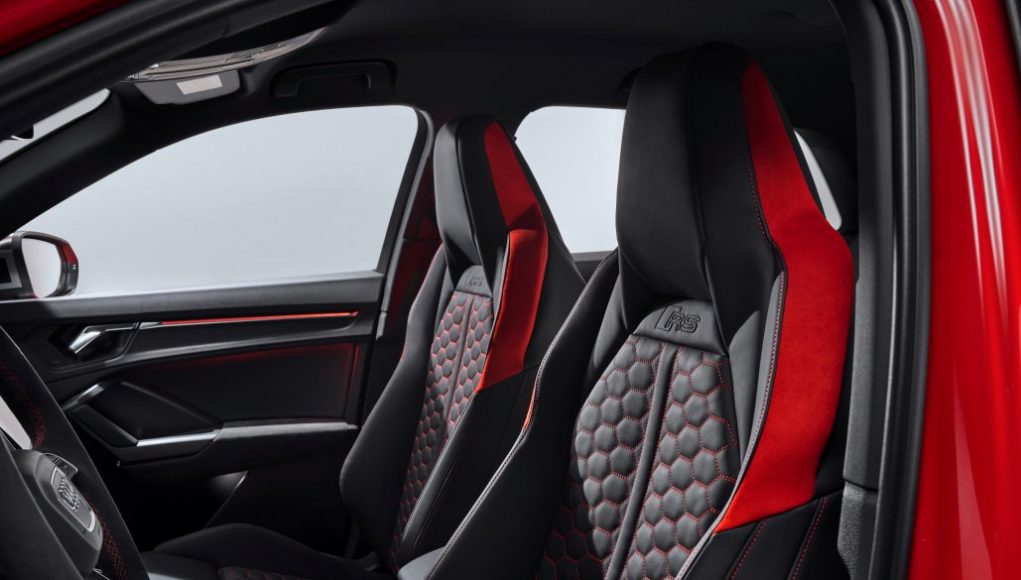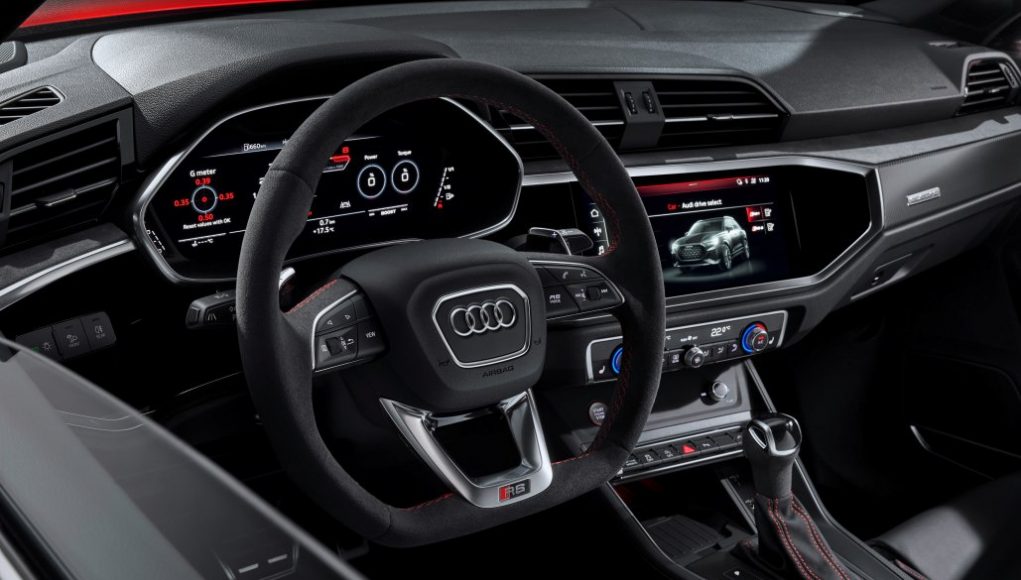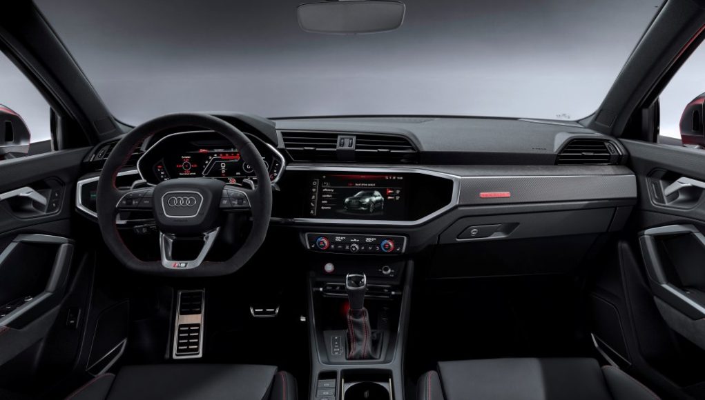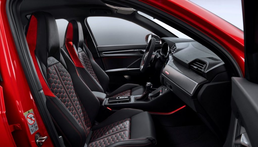 Los asientos RS sport con piel Nappa fina, dibujo en panal específico RS y reposacabezas integrados, están disponibles por primera vez en la familia Q3. Sus costuras en contraste son de serie en color negro, y opcionalmente en rojo o azul. Si se selecciona uno de los dos packs de diseño RS en rojo o azul, ese color se ve resaltado en el aro del volante, en los cinturones de seguridad, en las alfombrillas y en la palanca de cambio; el volante y la palanca están tapizados en Alcantara. Con los packs de diseño RS ampliados, los paneles y reposabrazos de las puertas muestran recubrimientos de Alcantara en rojo o azul. Inserciones con terminación aluminio Race, antracita u, opcionalmente, piano, negro o carbono, complementan el deportivo interior. Por primera vez, el habitáculo puede estar terminado enteramente en negro.