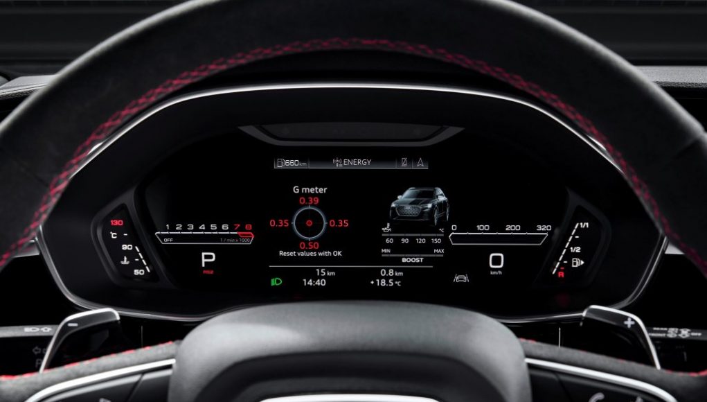 La pantalla MMI touch, con su marco negro de alto brillo, se integra perfectamente en el conjunto. La arquitectura del salpicadero con el Audi virtual cockpit plus en diseño RS armoniza perfectamente con el concepto operativo. Cuando se acerca el régimen de giro máximo del motor, el Audi virtual cockpit plus lo indica con una señal lumínica de cambio de velocidad que induce al conductor a subir de marcha. Las configuraciones especiales RS en el Audi virtual cockpit plus también aportan información sobre la presión de los neumáticos, el par motor, la potencia, los tiempos de vuelta, las fuerzas G y mediciones de aceleración.