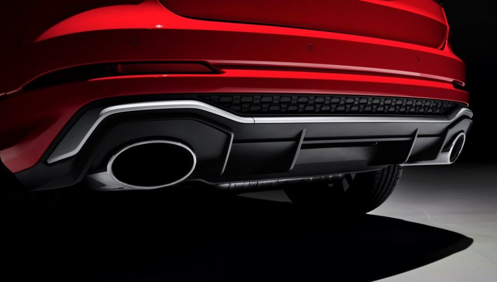 El diseño de la zaga también parece muy potente. Con la baja luneta trasera y el spoiler trasero del techo acabado en negro brillante, el RS Q3 Sportback parece aún más ancho que el RS Q3. La baja línea de techo culmina en los robustos pilares traseros, que están muy inclinados. El largo spoiler trasero, específico de los RS, enfatiza en el RS Q3 la sensación de poder del SUV de altas prestaciones, a la vez que asegura la carga aerodinámica de la zaga. La nueva generación del RS Q3 incluye por primera vez un sistema escape RS con dos grandes salidas ovales a ambos lados y embellecedores cromados. Este sistema de escape se combina con un paragolpes específico RS con difusor posterior y lamas horizontales en aluminio mate. Opcionalmente, el difusor trasero y las lamas están disponibles en negro brillante.