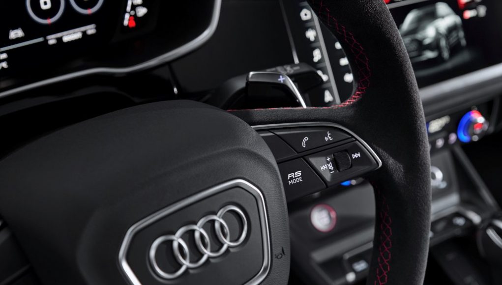 La iluminación de entrada con proyección Audi Sport en las puertas da la bienvenida al conductor y al ocupante delantero. Los logos RS adornan el interior del volante y los umbrales de las puertas delanteras están iluminados. El volante de cuero RS sport, achatado en su parte inferior, incluye levas de cambio de nuevo diseño, y botones multifunción que permiten al conductor controlar los dos modos RS opcionales en el Audi drive select. La configuración específica RS se muestra automáticamente en el Audi virtual cockpit plus.