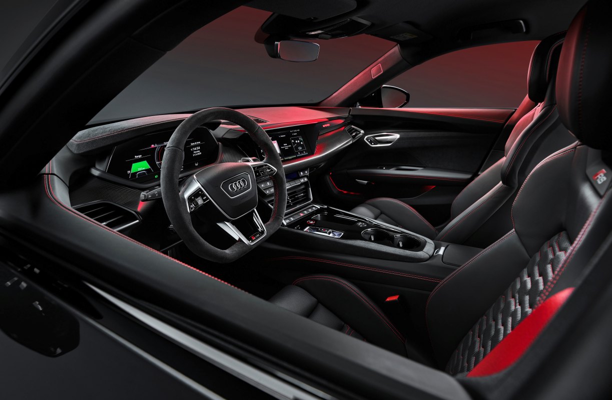 Todos los materiales del interior del e-tron GT se procesan con gran calidad. El panel de instrumentos incluye de serie un acabado en gris grafito o plata paladio (en el modelo RS); como alternativa se puede elegir madera de nogal de poro abierto o carbono con terminación mate. El paquete de iluminación ambiente plus (opcional en el e-tron GT quattro, de serie en el RS e-tron GT) agrega sutiles efectos de luz en determinadas zonas, incluidos los contornos de los altavoces de las puertas. El logo “e-tron GT” se proyecta en el suelo cuando el conductor abre las puertas. En el RS e-tron GT, los elementos de diseño, colores y materiales de Audi Sport ponen el acento en la deportividad.