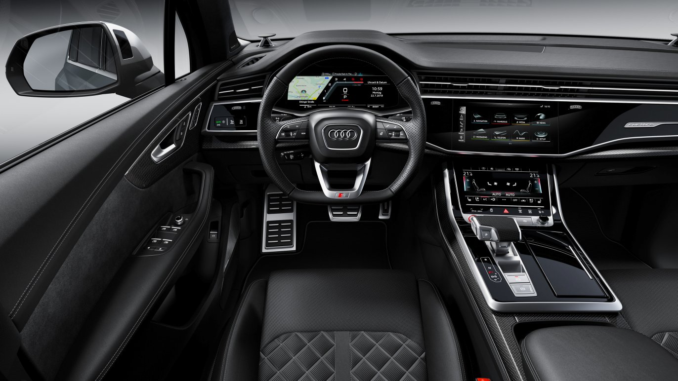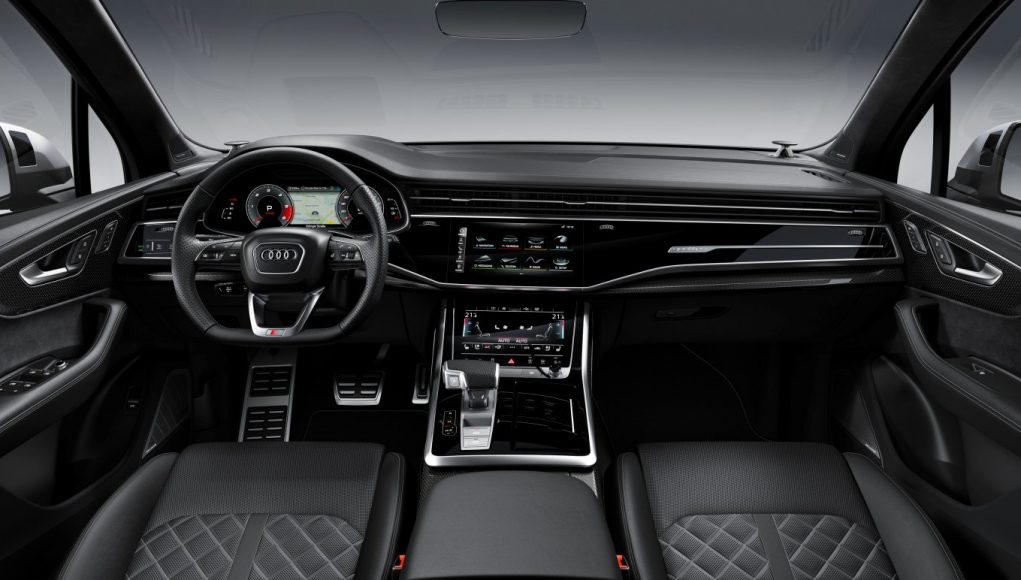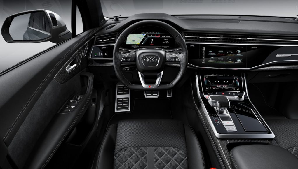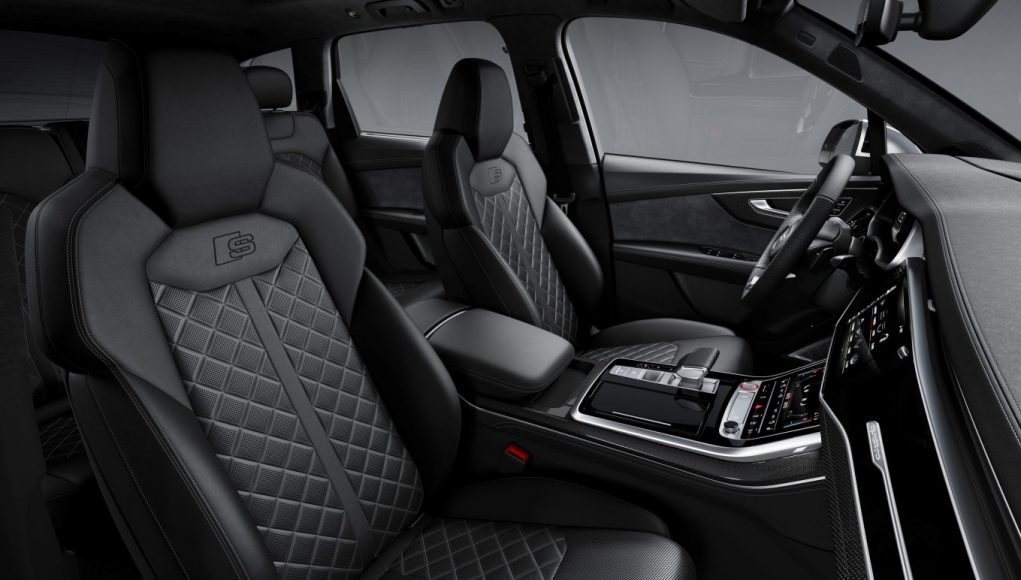 Una combinación de cuero/Alcantara en negro caracteriza el interior del Audi SQ7. Las inserciones incluyen aluminio mate cepillado u, opcionalmente, fibra de carbono, realzando la apariencia deportiva. Como opción, el paquete de iluminación ambiente de contorno realza las superficies y las líneas características del diseño en 30 colores ajustables. Además de los asientos deportivos, de serie también se incluyen los umbrales de las puertas delanteras iluminados con el logo S. Los pedales, el reposapié y el protector del umbral de carga del maletero son de acero inoxidable.