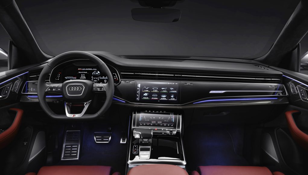 El Audi SQ8 TDI cuenta con dos pantallas táctiles con retroalimentación háptica y acústica como principales elementos para el control de los distintos sistemas del vehículo. La pantalla superior, integrada en un gran bisel con acabado negro en alto brillo, resulta prácticamente invisible cuando está apagada, y se utiliza para controlar los sistemas de infotainment y el navegador. El conductor utiliza la pantalla inferior para controlar la climatización, funciones de confort y la entrada de texto, que puede realizarse cómodamente con la muñeca apoyada en la palanca selectora del cambio.