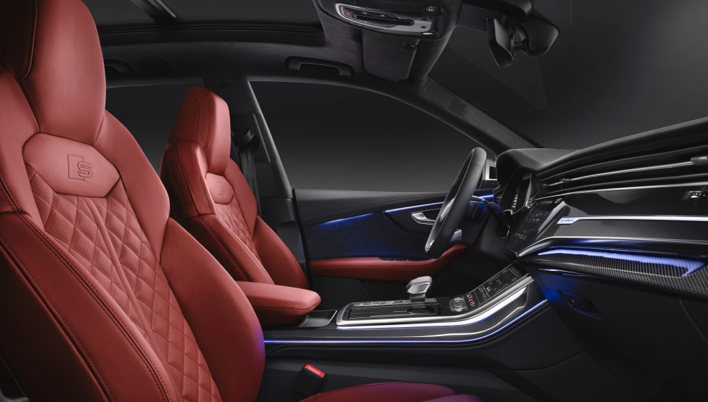 Con una distancia entre ejes de 3 metros, el Audi SQ8 TDI ofrece un espacioso habitáculo. El interior presenta un diseño en el que dominan las líneas horizontales. Los asientos deportivos forman parte del equipamiento de serie. Como opción, los clientes pueden solicitar los asientos S sport plus con reposacabezas integrados y refuerzos laterales, que pueden contar con control de temperatura y funciones de masaje. Los tres asientos de la segunda fila cuentan con regulación longitudinal independiente. Con los respaldos abatidos, la capacidad del maletero, al que se accede a través del portón trasero de accionamiento eléctrico, aumenta desde los 605 litros hasta los 1.755 litros.