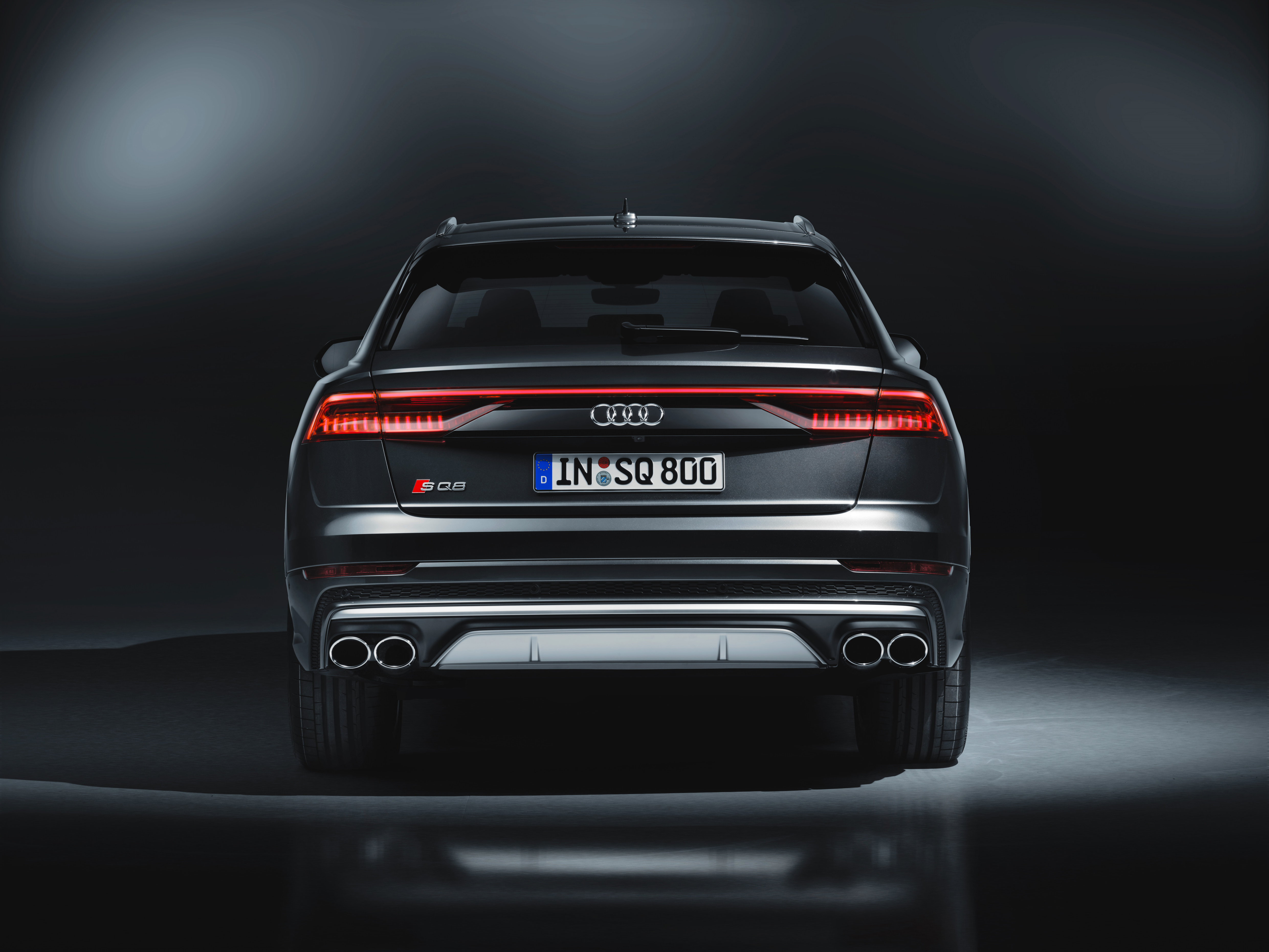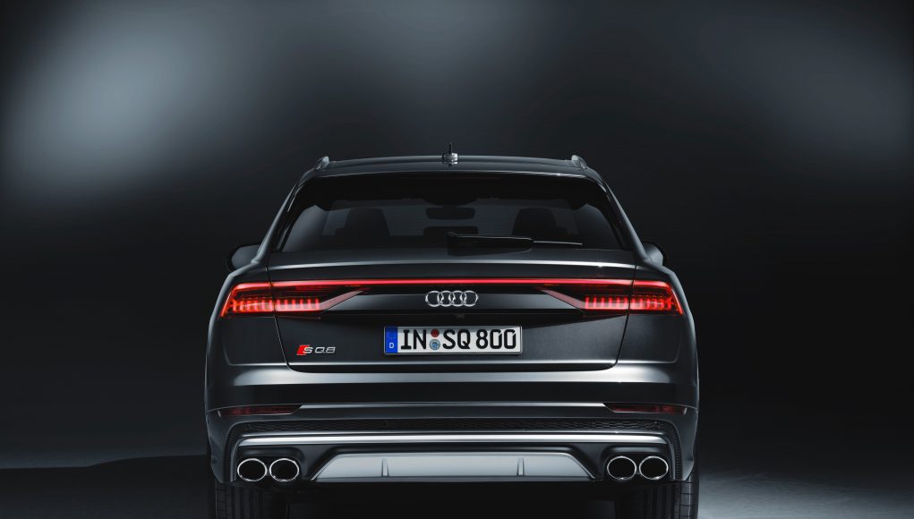 La parrilla singleframe está formada por lamas dobles y se encuentra rodeada por un gran marco cromado acabado en plata mate. El soporte bajo la parrilla y las entradas de aire bien definidas, la protección de la parte inferior de la carrocería y las inserciones en los umbrales laterales destacan en el mismo acabado. Las carcasas de los espejos retrovisores están diseñadas con una terminación en símil aluminio que va a juego. Los elementos exteriores característicos de la parte posterior también se resaltan en color. El difusor, en negro titanio mate, integra un protector inferior acabado en color plateado, y está flanqueado a ambos lados por dos tubos de escape redondos. En combinación con la llamativa franja que se extiende por la parte superior y con la deportiva inserción de rejilla en acabado panal de nido de abeja, el Audi SQ8 TDI manifiesta todo su potencial. Como opción, Audi ofrece el paquete de estilo negro, que acentúa el área de los paragolpes, la parrilla singleframe y las ventanillas laterales.