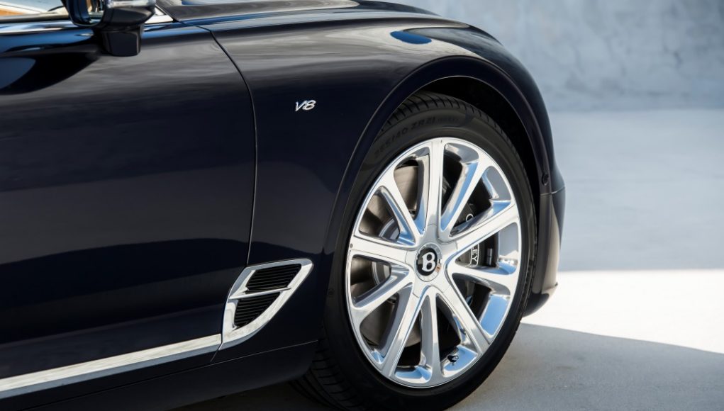 Los nuevos modelos V8 incorporan llantas de aleación de 20″ y diez radios con acabado pintado de serie, además de otros nueve otros diseños opcionales de hasta 22″. La carrocería se encuentra disponible de serie en siete colores distintos de Bentley, con una amplia gama de colores adicionales opcionales. Tanto el GT V8 como el GT V8 Convertible destacan por sus tubos de escape dobles y las sutiles insignias V8 en los alerones delanteros.