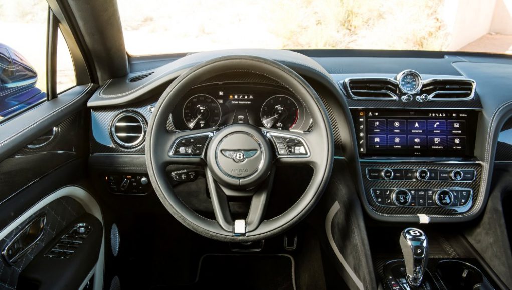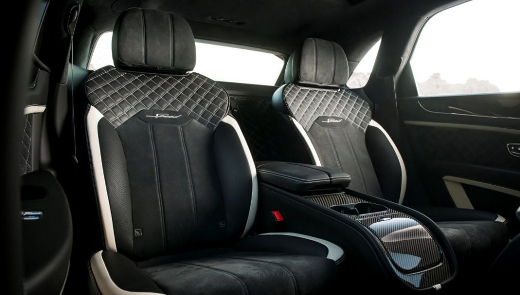 Los clientes que deseen ampliar aún más el aspecto deportivo de su Bentayga Speed ​​pueden seleccionar la Especificación Negra. Este paquete llamativo reemplaza todo el trabajo de cromo exterior, los detalles brillantes y algunos elementos de la carrocería con versiones en negro brillante o fibra de carbono, para una declaración visual impactante. El divisor del parachoques delantero y los umbrales laterales se crean a mano en fibra de carbono, mientras que el difusor del parachoques trasero se vuelve negro brillante. Todos los elementos exteriores brillantes (incluidos los rieles del techo) son resplandecientes en negro brillante, al igual que las llantas Bentayga Speed ​​de 22 ”y los acabados de escape. Finalmente, el spoiler de techo estándar se reemplaza por una versión curva de fibra de carbono.