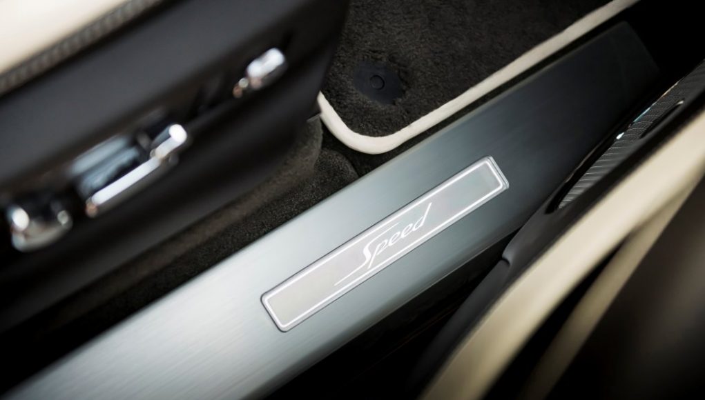 Un nuevo diseño de costuras en contraste a través del acolchado de diamantes de la especificación de conducción de Mulliner (incluido de serie) es exclusivo de Speed, con cada una de las líneas de costura que atraviesan el acolchado divididas, una para combinar con el cuero y la otra en el color de contraste. El discreto distintivo Speed ​​de metal en la fascia delantera y las estriberas iluminadas Speed ​​completan el estilo característico.